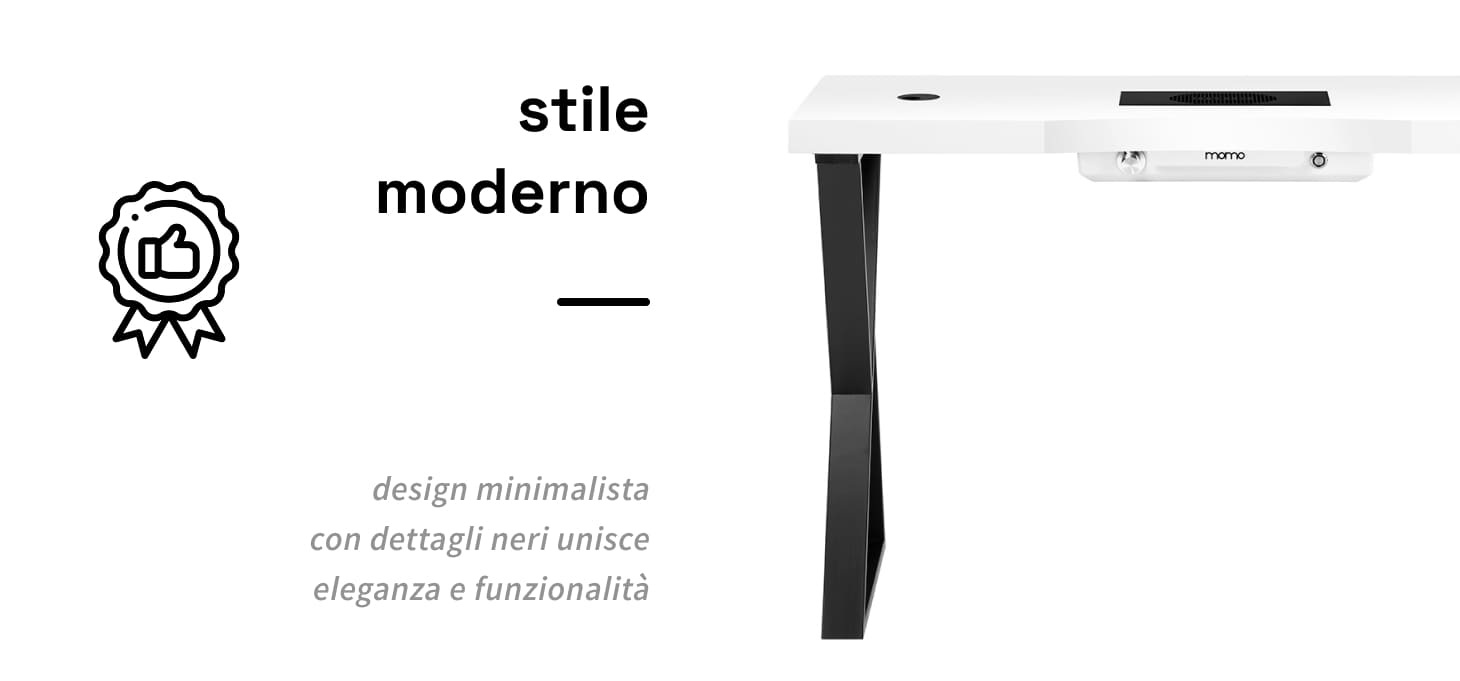 Il depolveratore a cassetta Momo J-02 integrato nel piano di lavoro migliora notevolmente il comfort e l'igiene del lavoro, rimuovendo efficacemente la polvere generata durante i trattamenti cosmetici come la manicure. Con questo dispositivo, l'aria del salone rimane pulita e l'area di lavoro priva di contaminazioni, aumentando la sicurezza sia per l'estetista che per i clienti. L'assorbitore di polvere è facile da usare e da mantenere, il che ne migliora ulteriormente la funzionalità. La pulizia e la sostituzione regolare dei filtri garantiscono un'efficienza di assorbimento sempre elevata. È possibile acquistare filtri di ricambio aggiuntivi (SKU 123581).