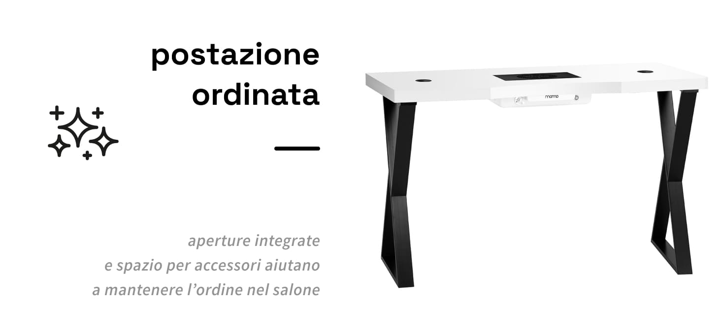 Il banco cosmetico Momo 04 è una combinazione di eleganza minimalista e soluzioni pratiche, progettata pensando agli utenti più esigenti. L 'ampia superficie di lavoro garantisce il comfort durante lo svolgimento delle attività quotidiane nel salone di bellezza.