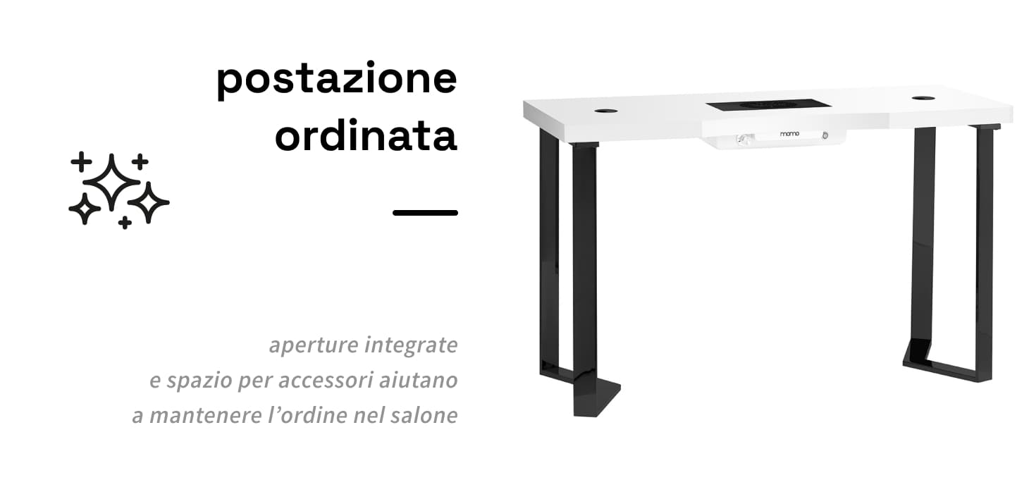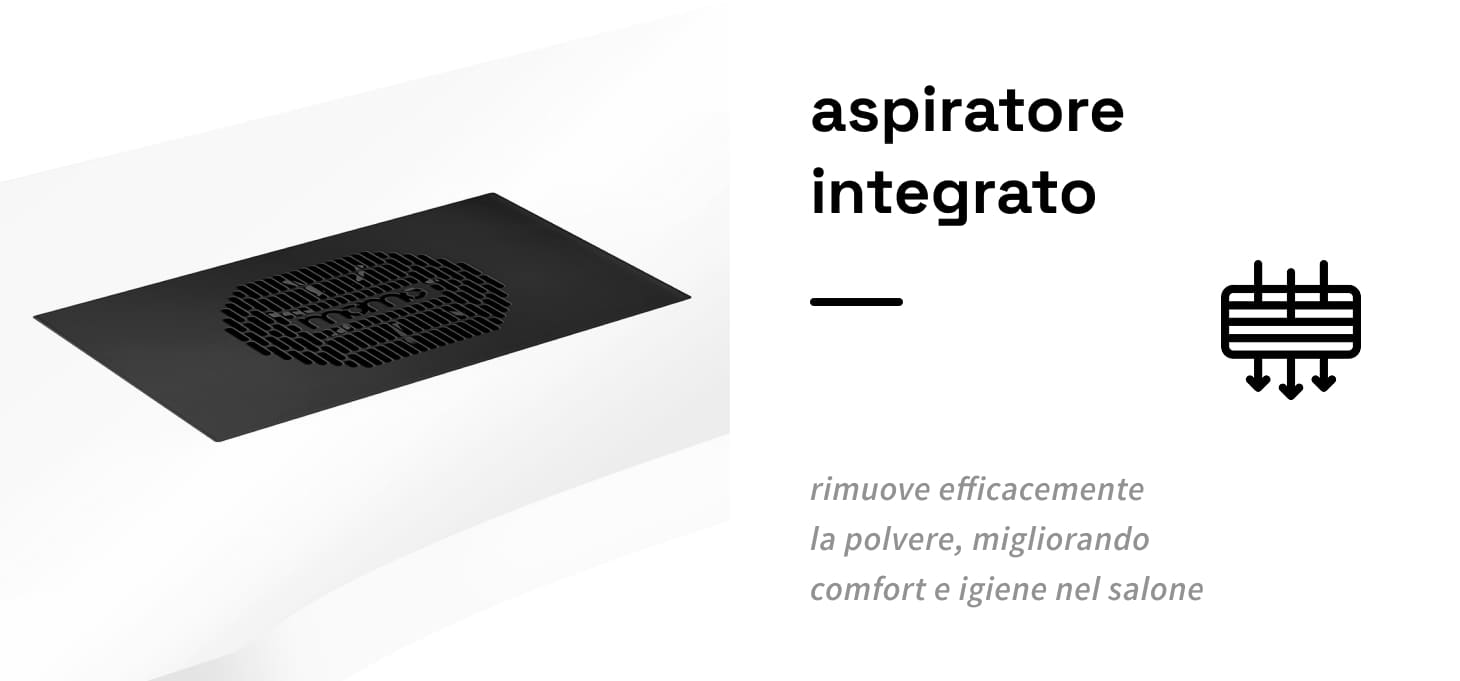 L'assorbitore di polvere a cassetta Momo J-02 integrato nel piano di lavoro migliora notevolmente il comfort e l'igiene, eliminando efficacemente la polvere generata durante i trattamenti cosmetici come la manicure. Con questo dispositivo, l'aria del salone rimane pulita e l'area di lavoro priva di contaminazioni, aumentando la sicurezza sia per l'estetista che per i clienti. L'assorbitore di polvere è facile da usare e da mantenere, il che ne migliora ulteriormente la funzionalità. La pulizia e la sostituzione regolare dei filtri garantiscono un'efficienza di assorbimento sempre elevata. È possibile acquistare filtri di ricambio aggiuntivi (SKU 123581).