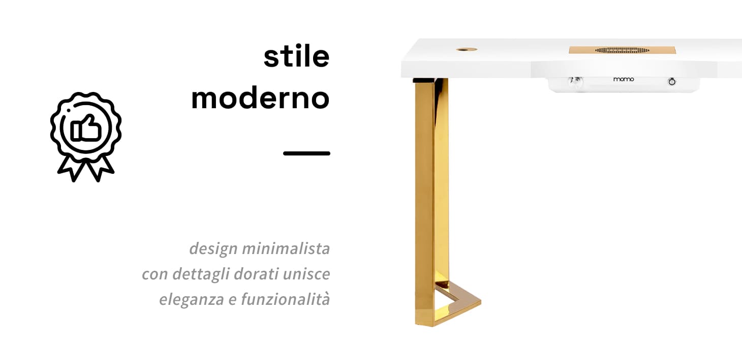 La scrivania cosmetica Momo 05 è una combinazione unica di semplicità e stile, progettata pensando agli utenti più esigenti. Il design minimalista con elementi dorati ne esalta il carattere elegante. Il piano liscio e lucido garantisce il comfort durante lo svolgimento delle attività quotidiane nel salone di bellezza.