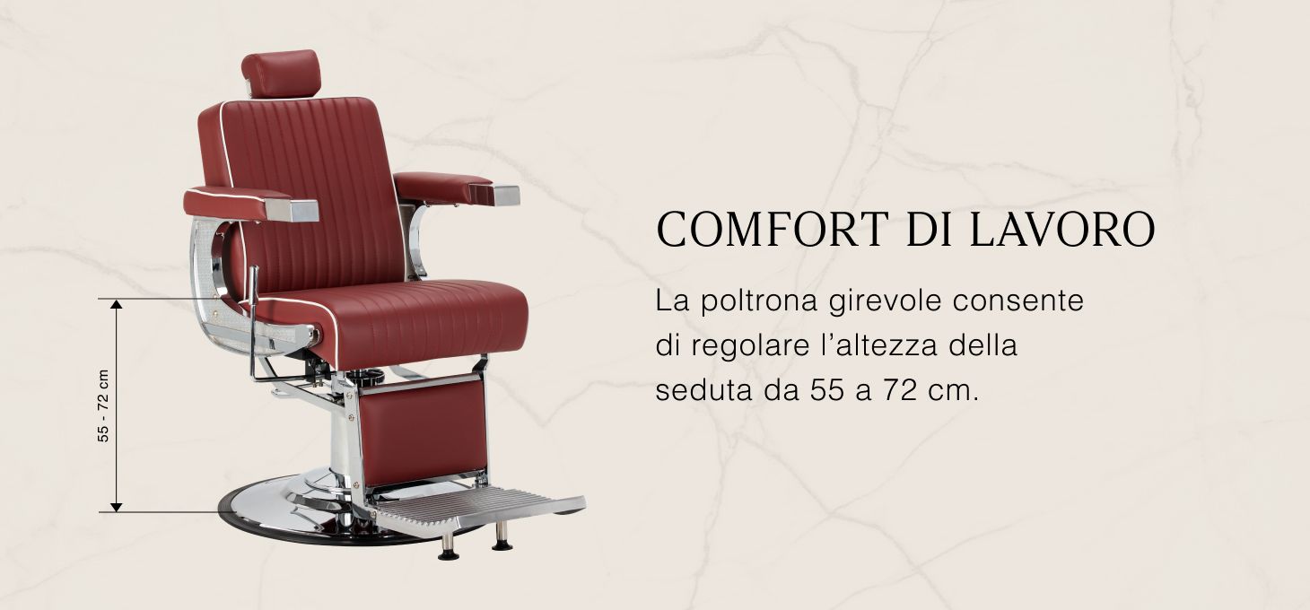 Il sedile imbottito di morbida schiuma offre un elevato livello di comfort al cliente, anche durante i trattamenti più lunghi. Lo schienale ergonomico sostiene la schiena e consente di assumere una posizione comoda, per un maggiore relax e una migliore esperienza di trattamento. Il meccanismo di rotazione completa della poltrona aumenta la libertà di movimento, facilitando l'accesso da tutti i lati e migliorando il flusso di lavoro dello stilista. I braccioli imbottiti, posti all'altezza ottimale, favoriscono il posizionamento naturale delle braccia e prevengono la tensione nella zona delle spalle e del collo.