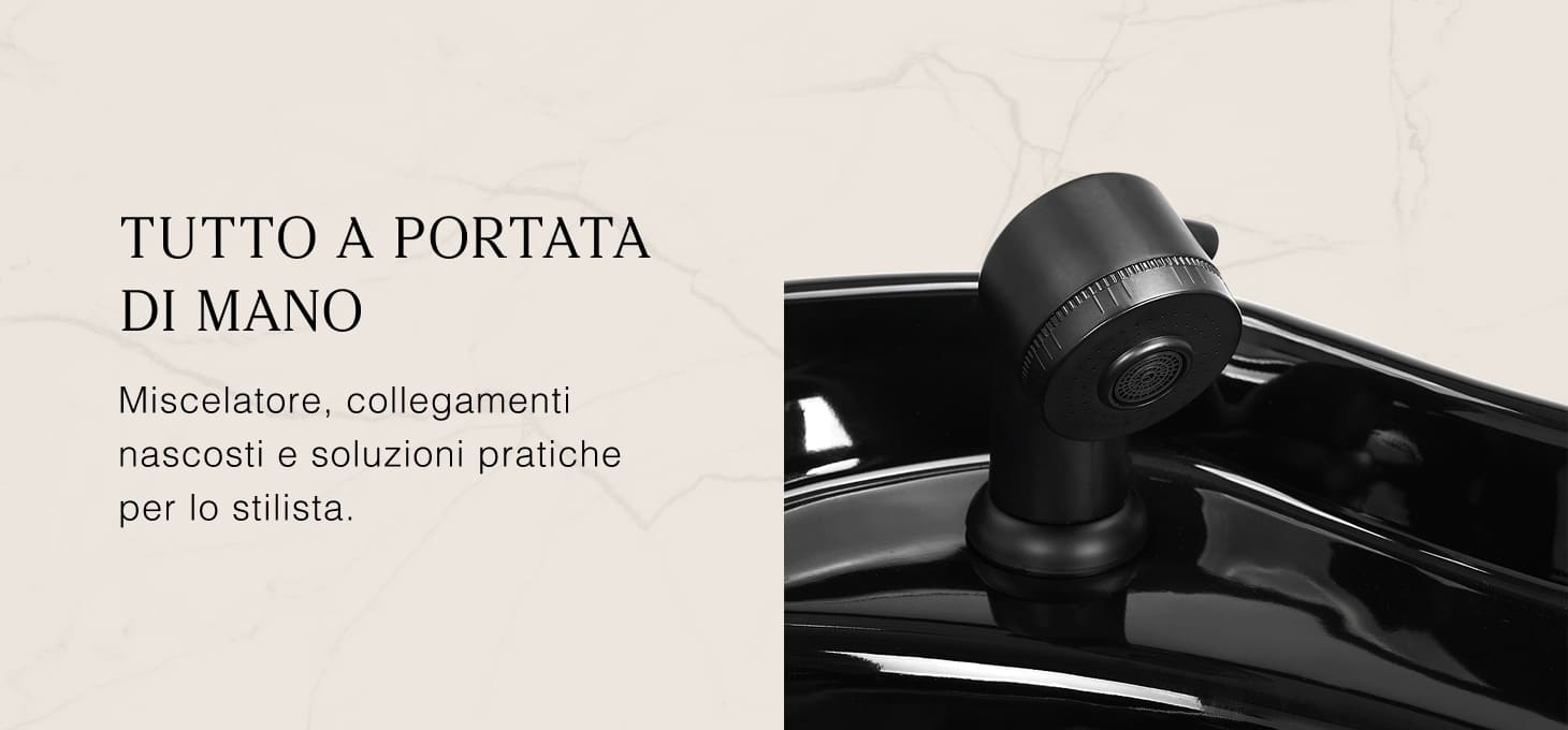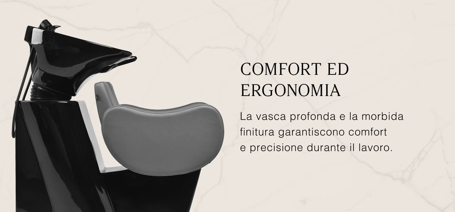 La profonda vasca in ceramica nei toni del nero riduce gli schizzi d'acqua e dei prodotti utilizzati durante i trattamenti. L 'inclinazione regolabile della vasca consente di adattarla alle esigenze individuali e il materiale utilizzato rende il lavabo durevole, resistente alle macchie e ai graffi e facile da mantenere pulito. Il collare dal profilo ergonomico offre un comodo appoggio per la testa, mentre il morbido rivestimento in plastica nera elimina la sensazione di freddezza della superficie in ceramica.