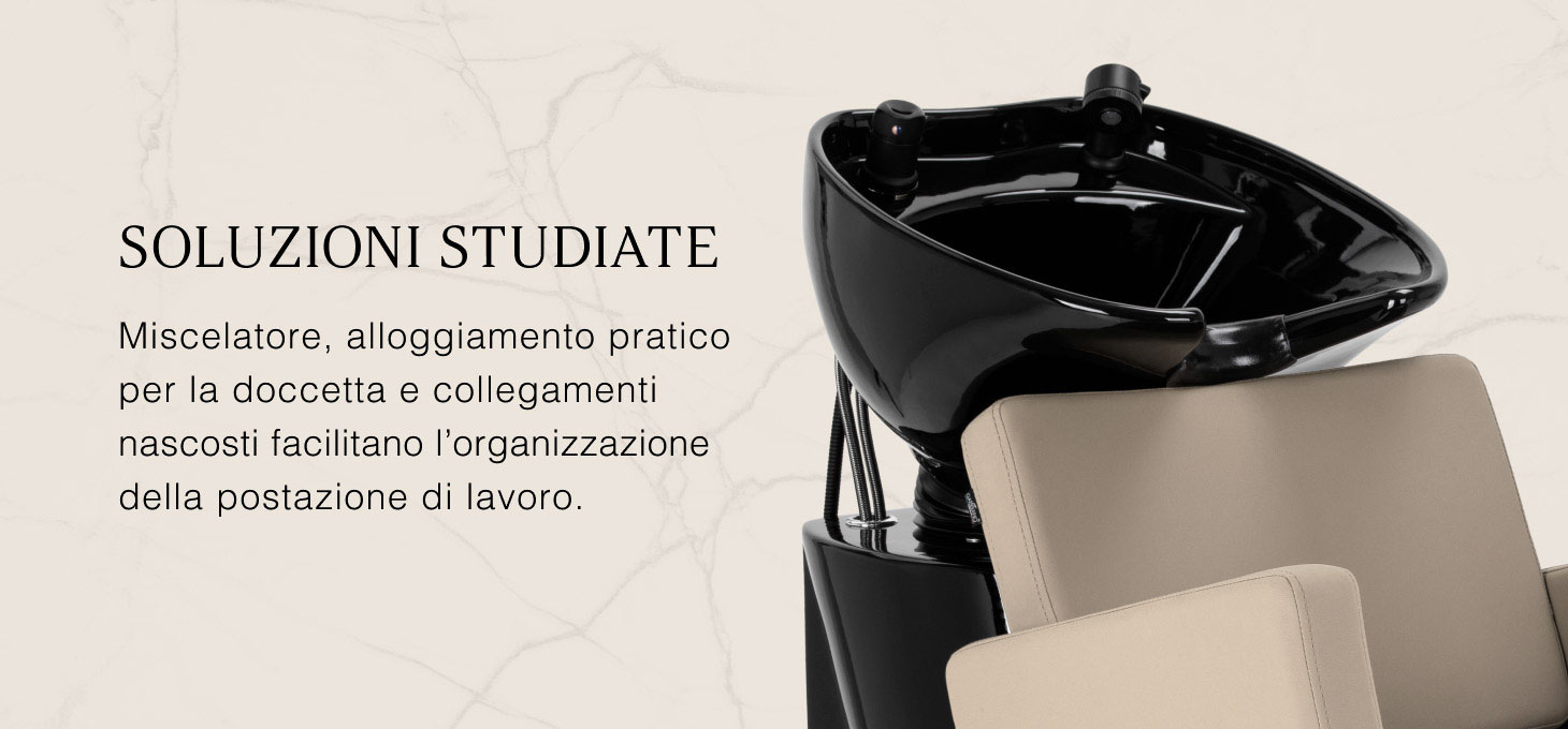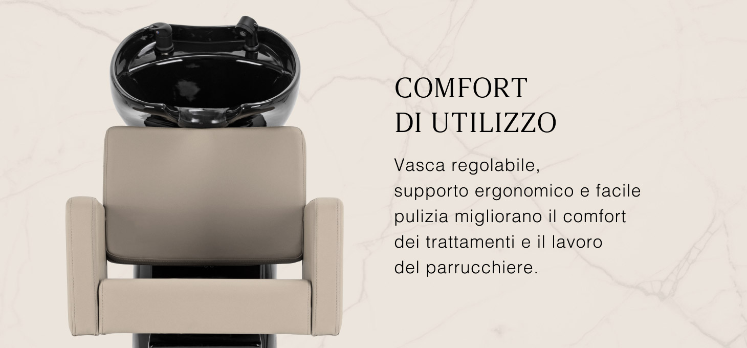 Il lavaggio Gabbiano Vitoria combina estetica moderna e funzionalità, integrandosi perfettamente nell'arredamento dei saloni moderni. La struttura integrata garantisce stabilità, mentre la forma ergonomica della poltrona assicura il comfort del cliente e la comodità del parrucchiere. Il sedile opportunamente sagomato favorisce il comfort durante i trattamenti più lunghi, mentre la forma minimalista si integra perfettamente con gli arredi degli interni moderni.