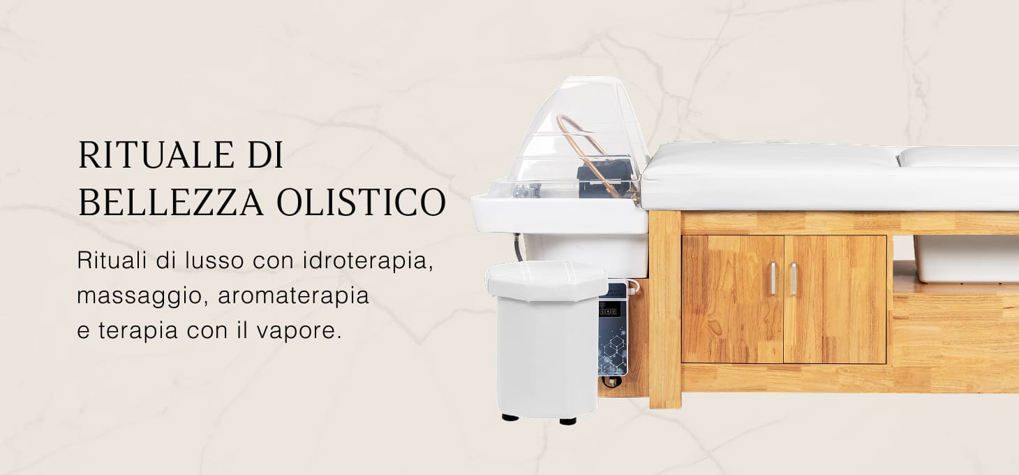 In dotazione: lettino Head Spa, cappa Head Spa, vaporizzatore, cuscino a due pezzi, pouf.