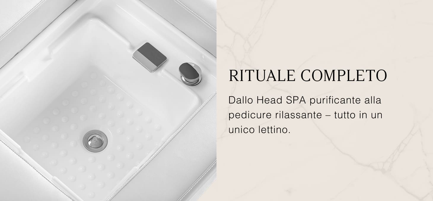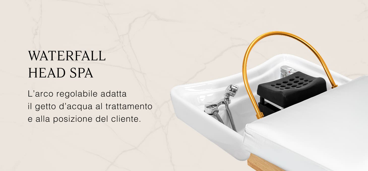 Uno speciale arco con inclinazione regolabile crea un effetto cascata che pulisce intensamente il cuoio capelluto e agisce come un massaggio naturale, migliorando la circolazione sanguigna, riducendo la tensione e lo stress. Il flusso d'acqua controllato con precisione favorisce la rigenerazione dei capelli e idrata intensamente la pelle. La cascata regolabile offre una pulizia profonda del cuoio capelluto e un rilassamento, dando sollievo a disturbi come mal di testa e rigidità del collo. Grazie a un sistema intelligente a circuito chiuso, l'arco preleva l'acqua dalla vasca e la riutilizza, garantendo un massaggio idrico continuo.