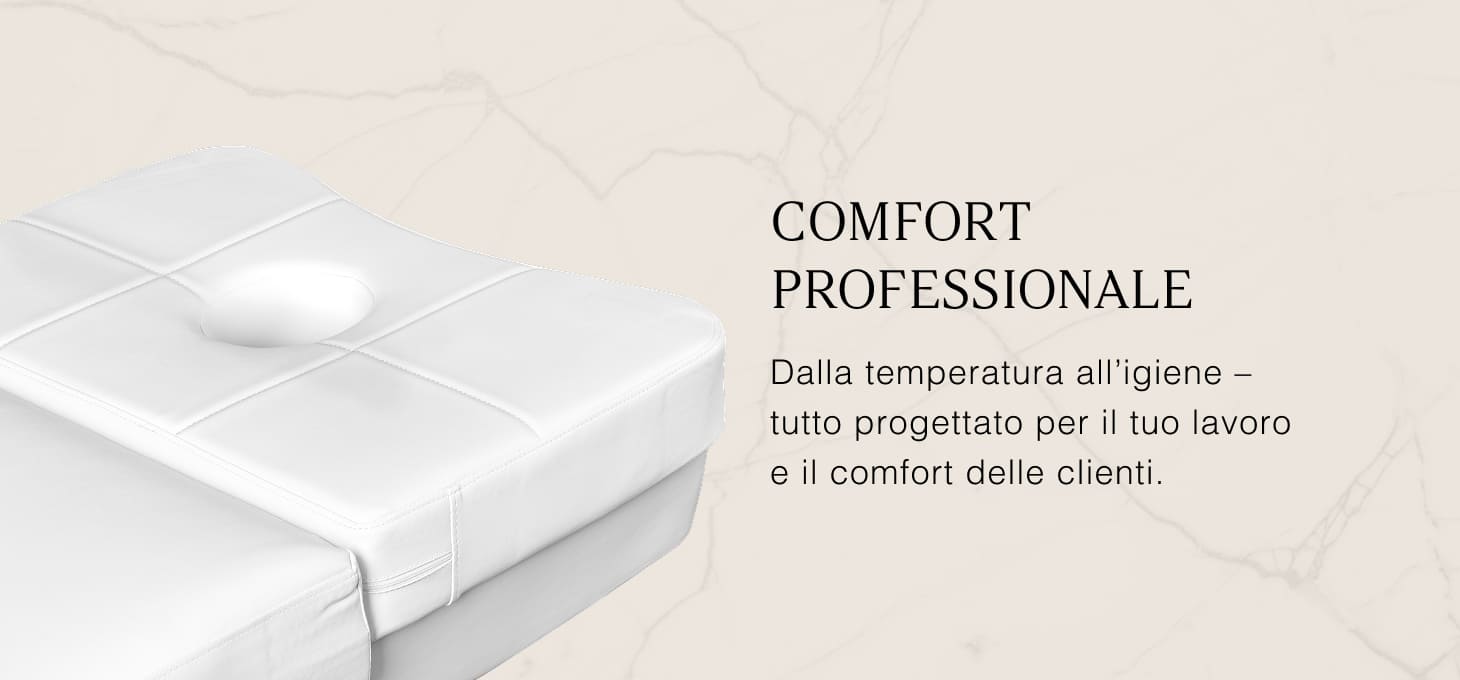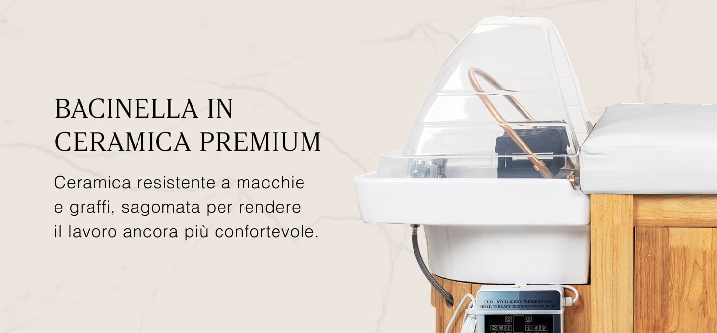 Una profonda vasca in ceramica nei toni del bianco riduce efficacemente gli schizzi di acqua e prodotti utilizzati durante i trattamenti, garantendo pulizia e comfort di lavoro. Realizzata in materiale durevole, la bacinella è resistente allo scolorimento, ai graffi e ai danni, e la sua superficie liscia rende la pulizia eccezionalmente facile. Il suo profilo distintivo non solo facilita l'accesso alla persona che esegue il servizio, ma conferisce all'unità di lavaggio un aspetto elegante e moderno. La combinazione di estetica e funzionalità eleva lo standard di qualsiasi spazio professionale.