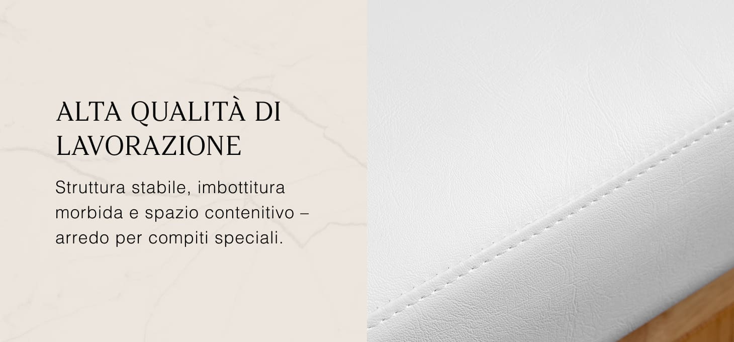 Il lettino Head Spa Bali è una combinazione armoniosa di funzionalità e design moderno. La sua struttura stabile è rafforzata da un solido telaio rifinito con elementi in legno esteticamente gradevoli, che aggiungono calore ed eleganza agli interni. La struttura robusta garantisce stabilità e durata per un uso prolungato. La superficie del lettino, profilata in modo ergonomico, è rivestita in morbida pelle sintetica nei toni dell'elegante bianco, che assicura il massimo comfort durante i trattamenti e allo stesso tempo ne facilita la pulizia. Un pratico armadietto situato sotto il lettino consente di riporre comodamente cosmetici e accessori, assicurando che tutti i prodotti necessari siano sempre a portata di mano. La combinazione di legno naturale, morbida pelle sintetica e design ergonomico rende Head Spa Bali un mobile elegante e funzionale per saloni di parrucchieri, SPA e centri benessere. È stato progettato per combinare il comfort d'uso con un'estetica senza tempo.