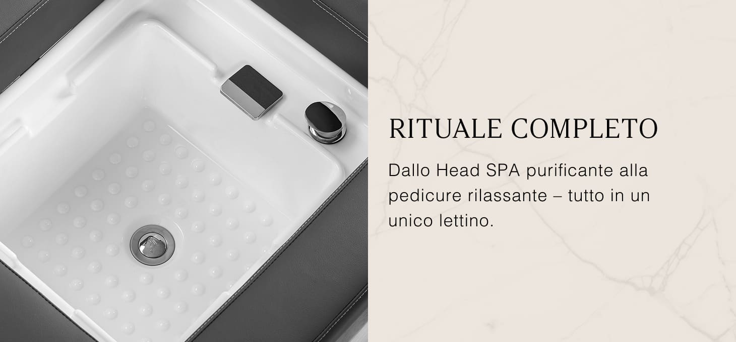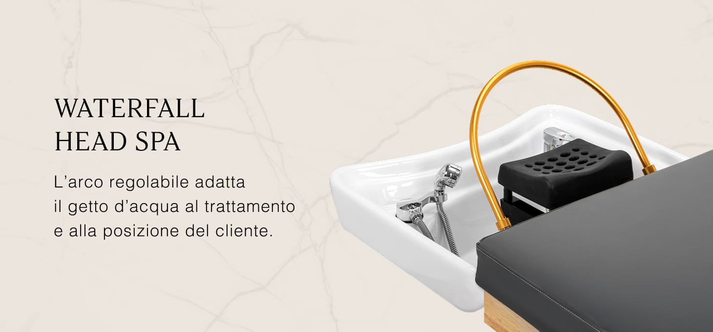 Uno speciale arco con inclinazione regolabile crea un effetto cascata che pulisce intensamente il cuoio capelluto e agisce come un massaggio naturale, migliorando la circolazione sanguigna, riducendo la tensione e lo stress. Il flusso d'acqua controllato con precisione favorisce la rigenerazione dei capelli e idrata intensamente la pelle. La cascata regolabile consente una pulizia profonda del cuoio capelluto e il rilassamento, dando sollievo a disturbi come mal di testa e rigidità del collo. Grazie a un sistema intelligente a circuito chiuso, l'arco preleva l'acqua dalla vasca e la riutilizza, garantendo un massaggio idrico continuo.