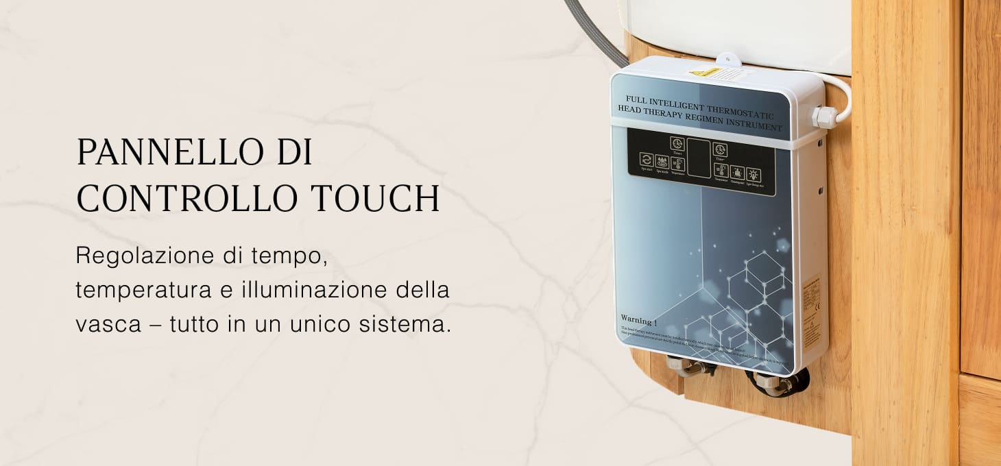 L'intuitivo pannello a sfioramento consente il pieno controllo dei parametri di trattamento, garantendo la massima facilità d'uso. Consente di regolare il tempo di funzionamento e la temperatura dell'acqua, nonché di monitorare in tempo reale le impostazioni. Il pannello consente anche di attivare la terapia della luce: la luce nella vasca crea un'atmosfera rilassante e migliora la sensazione di lusso del trattamento. Inoltre, il dispositivo per la terapia del vapore è dotato di un telecomando per un comodo utilizzo.