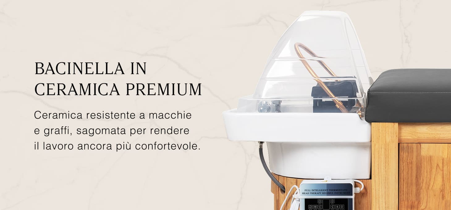 Una profonda vasca in ceramica nei toni del bianco riduce efficacemente gli schizzi di acqua e prodotti utilizzati durante i trattamenti, garantendo pulizia e comfort di lavoro. Realizzata in materiale durevole, la bacinella è resistente allo scolorimento, ai graffi e ai danni, e la sua superficie liscia rende la pulizia eccezionalmente facile. Il suo profilo distintivo non solo facilita l'accesso alla persona che esegue il servizio, ma conferisce all'unità di lavaggio un aspetto elegante e moderno. La combinazione di estetica e funzionalità eleva lo standard di qualsiasi spazio professionale.