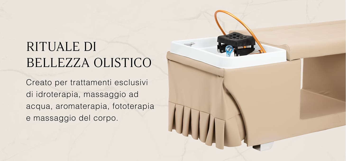 L'elegante lettino Gabbiano Head Spa Maldives con unità di lavaggio integrata è una soluzione innovativa progettata per trattamenti professionali di cura e relax. È perfetto per i lussuosi rituali giapponesi Head Spa, ampliando l'offerta del salone con un'ampia gamma di terapie per cuoio capelluto e capelli. Combina tecniche di idroterapia, massaggio ad acqua, aromaterapia e tecniche di terapia della luce, offrendo un'esperienza completa e olistica. Tecnologie avanzate combinate con un design ergonomico garantiscono un comfort eccezionale per i clienti e facilitano il lavoro dei professionisti della bellezza e del benessere. Il Gabbiano Head Spa Maldives combina tradizione e modernità, offrendo un profondo relax, nutrimento e idratazione del cuoio capelluto e dei capelli. Può essere utilizzata anche per il massaggio del corpo, diventando così uno strumento terapeutico e di relax versatile.