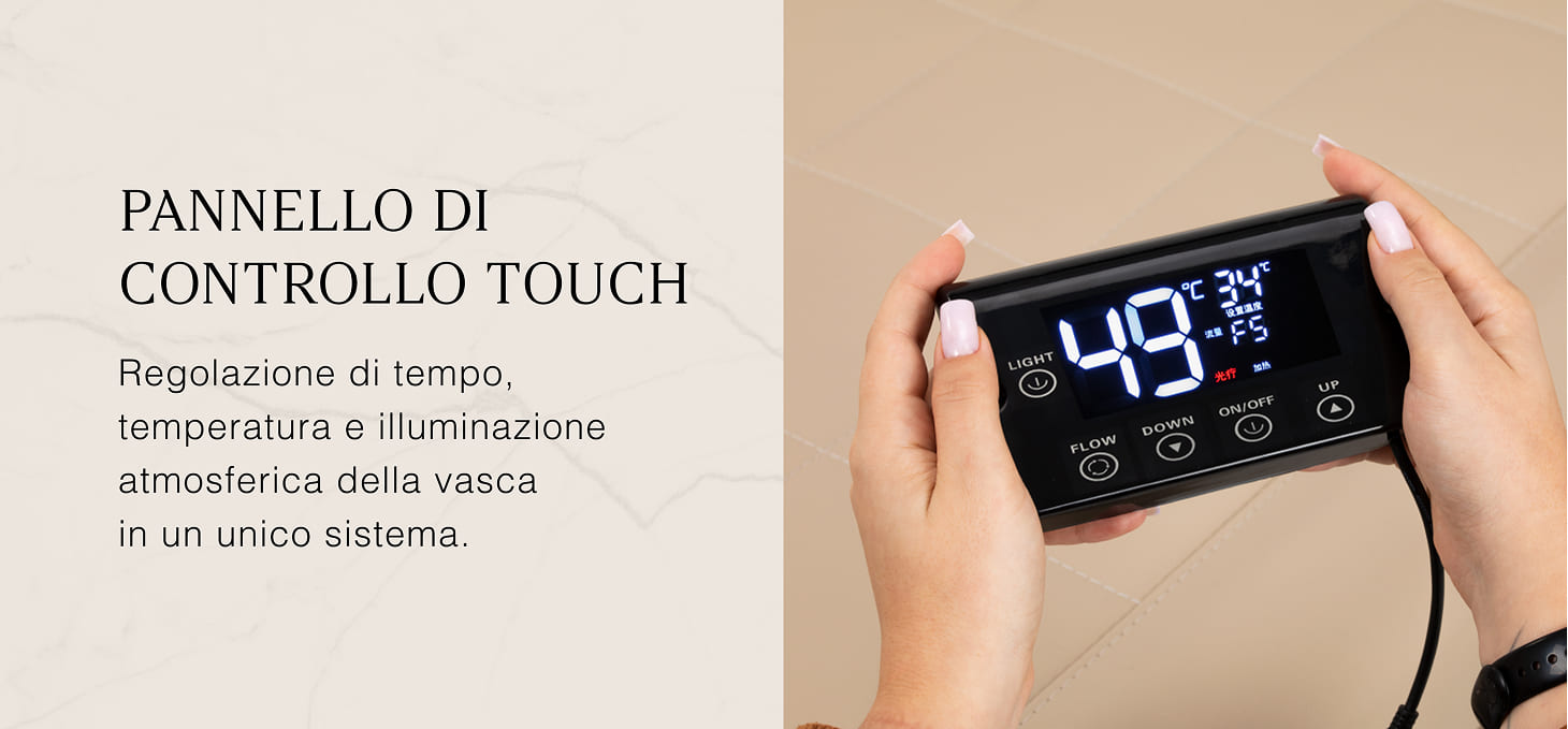 L'intuitivo pannello a sfioramento consente il pieno controllo dei parametri di trattamento e la facilità d'uso. Consente di regolare il tempo di funzionamento e la temperatura dell'acqua, nonché di monitorare i valori correnti su un display chiaro e di facile lettura. Inoltre, il pannello consente di attivare la funzione di terapia della luce, che illumina la vasca creando un'atmosfera di relax e lusso. Il set comprende anche un telecomando che consente di controllare comodamente il dispositivo per la terapia del vapore a distanza.
