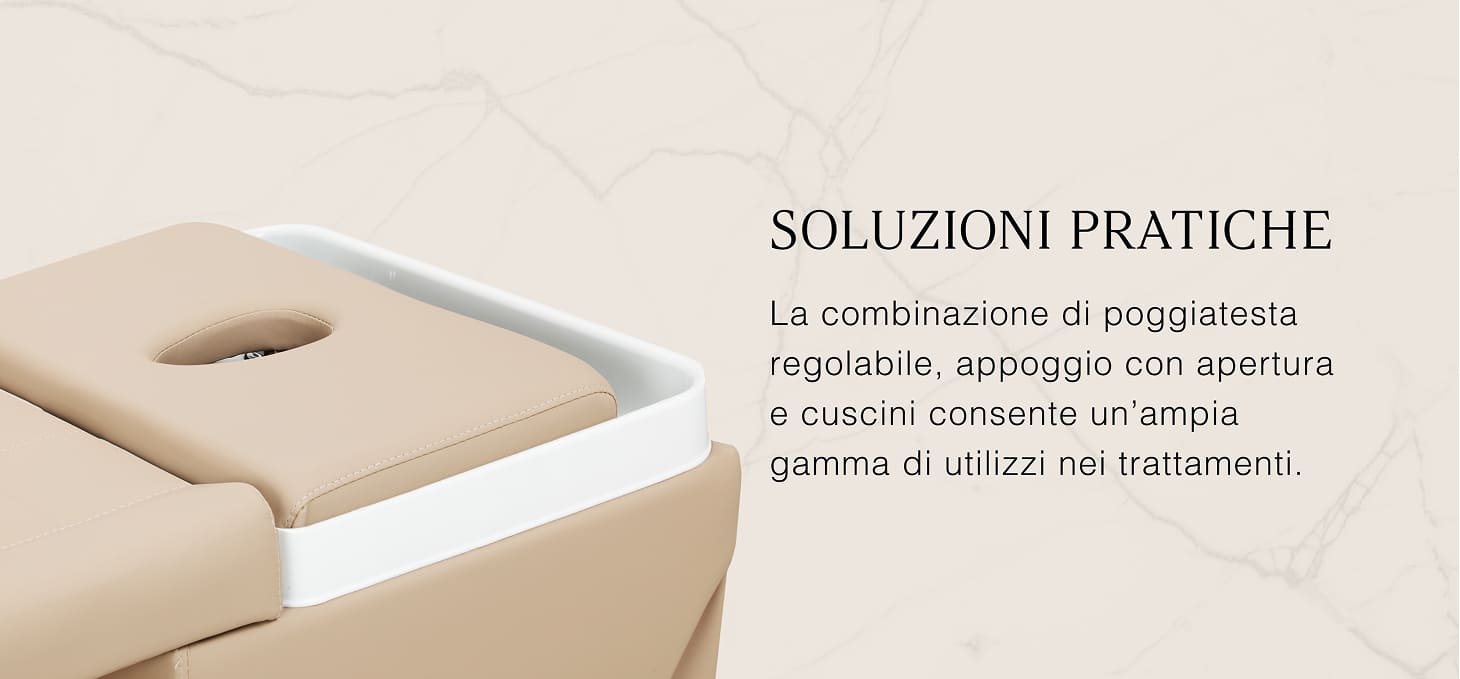 Il poggiatesta regolabile, con la possibilità di estendere e modificare l'angolo di inclinazione, permette di adattarsi perfettamente alle esigenze dell'utente, garantendo il massimo comfort. Il set comprende anche cuscini ergonomici, tra cui un poggiatesta con apertura per il viso, che amplia la gamma di applicazioni: dai trattamenti del cuoio capelluto ai massaggi e alle varie terapie del corpo e del viso. Queste pratiche caratteristiche rendono il lettino un'attrezzatura versatile per i saloni di bellezza e benessere, che combina il comfort del cliente con la funzionalità necessaria al professionista.