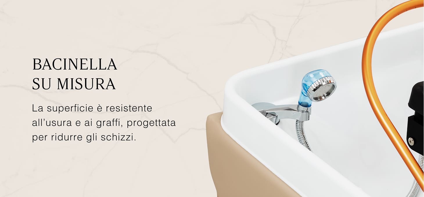 Il lavabo è dotato di un miscelatore che consente di regolare con precisione la temperatura dell'acqua in base alle esigenze del cliente. Uno spazio dedicato al soffione doccia migliora l'efficienza, mentre un tappo cromato con uno speciale filtro assicura il controllo del flusso dell'acqua e mantiene un elevato livello di igiene. L'attacco dell'acqua si trova all'interno della base, dietro il tessuto, nascondendo esteticamente le tubature e conferendo all'intera unità un aspetto elegante. Il lettino ergonomico assicura il comfort durante i vari trattamenti di bellezza. Un pratico pouf completa l'unità, aumentando il comfort del personale e migliorando la funzionalità dell'unità. Queste caratteristiche rendono l'unità di lavaggio ideale sia per i saloni di parrucchieri che per le SPA.