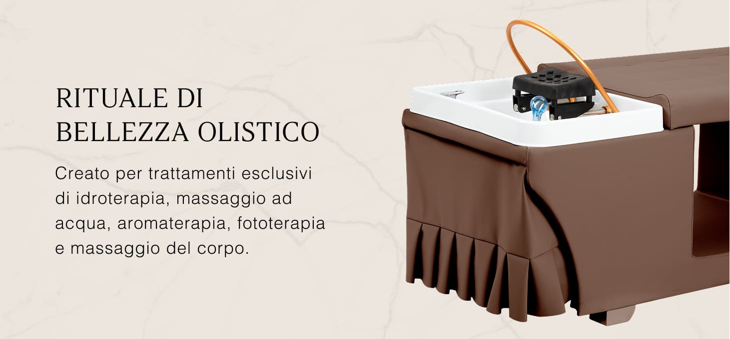 L'elegante lettino Gabbiano Head Spa Maldives con unità di lavaggio integrata è una soluzione innovativa progettata per trattamenti professionali di cura e relax. È perfetto per i lussuosi rituali giapponesi Head Spa, ampliando l'offerta del salone con un'ampia gamma di terapie per cuoio capelluto e capelli. Combina tecniche di idroterapia, massaggio ad acqua, aromaterapia e tecniche di terapia della luce, offrendo un'esperienza completa e olistica. Tecnologie avanzate combinate con un design ergonomico garantiscono un comfort eccezionale per i clienti e facilitano il lavoro dei professionisti della bellezza e del benessere. Il Gabbiano Head Spa Maldives combina tradizione e modernità, offrendo un profondo relax, nutrimento e idratazione del cuoio capelluto e dei capelli. Può essere utilizzata anche per il massaggio del corpo, diventando così uno strumento terapeutico e di relax versatile.