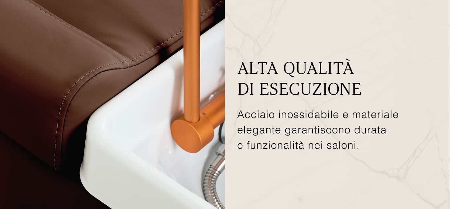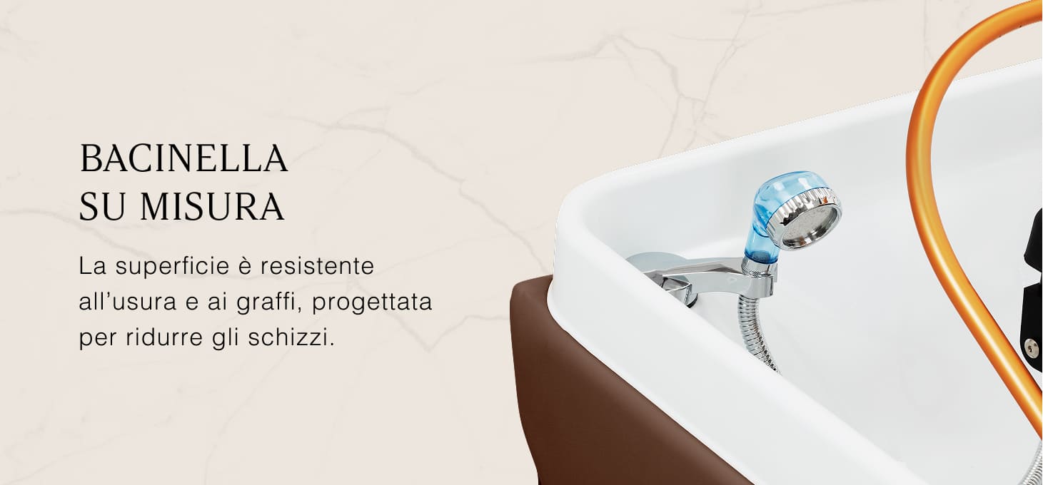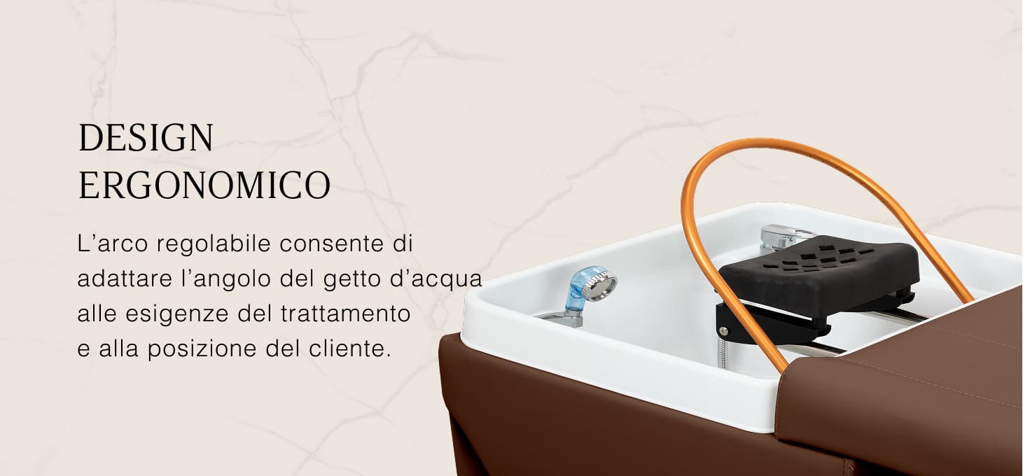 Il lavabo è dotato di un miscelatore che consente di regolare con precisione la temperatura dell'acqua in base alle esigenze del cliente. Uno spazio dedicato al soffione doccia migliora l'efficienza, mentre un tappo cromato con uno speciale filtro assicura il controllo del flusso dell'acqua e mantiene un elevato livello di igiene. L'attacco dell'acqua si trova all'interno della base, dietro il tessuto, nascondendo esteticamente le tubature e conferendo all'intera unità un aspetto elegante. Il lettino ergonomico assicura il comfort durante i vari trattamenti di bellezza. Un pratico pouf completa l'unità, aumentando il comfort del personale e migliorando la funzionalità dell'unità. Queste caratteristiche rendono l'unità di lavaggio ideale sia per i saloni di parrucchieri che per le SPA.