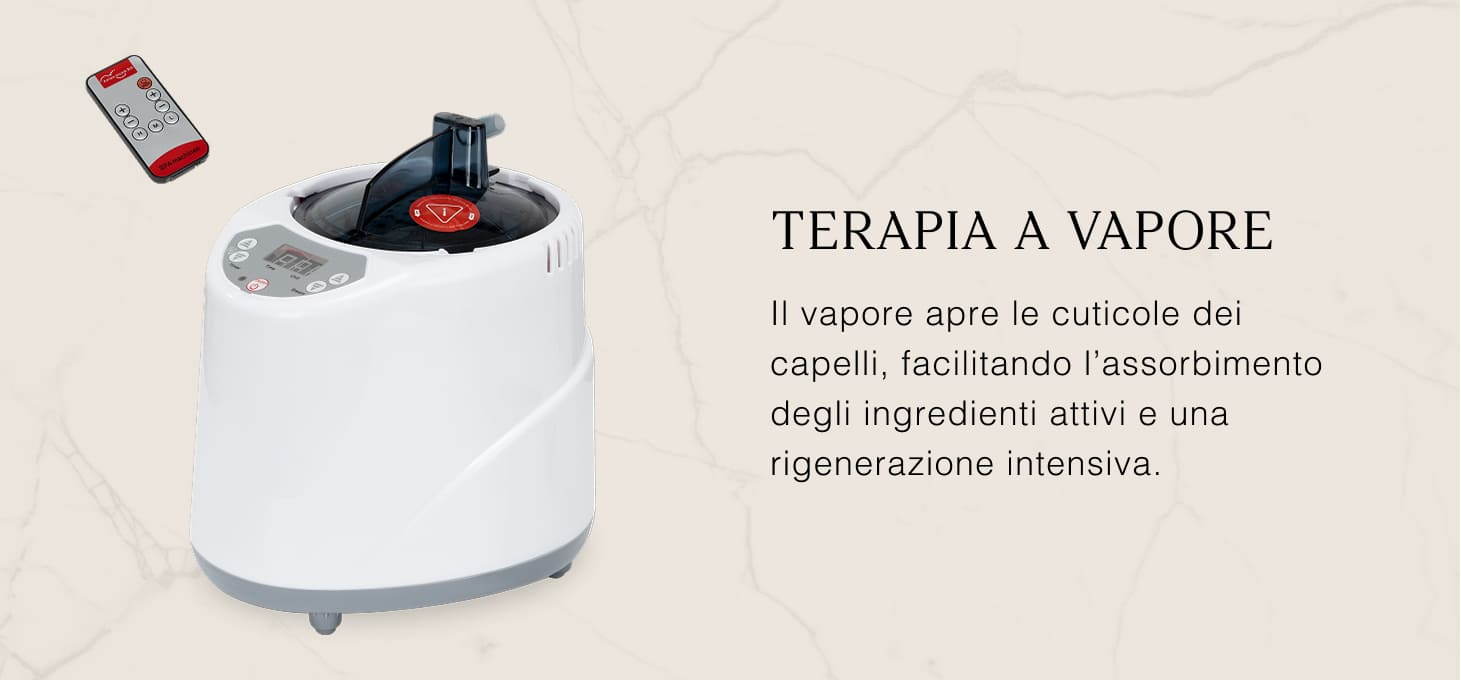 Il set comprende un dispositivo specializzato per la generazione di vapore e un copri lavandino dedicato che consente un trattamento preciso. Questo moderno metodo di cura sfrutta le proprietà del vapore per rigenerare e idratare intensamente i capelli. Ciò consente agli ingredienti attivi contenuti nelle maschere, nelle fiale e negli altri prodotti di penetrare più in profondità, favorendo la riparazione e il rafforzamento dei capelli. La terapia del vapore migliora la struttura dei capelli, aumenta la resistenza ai danni e ripristina una sana lucentezza, rendendo i capelli morbidi, elastici e pieni di vita.
