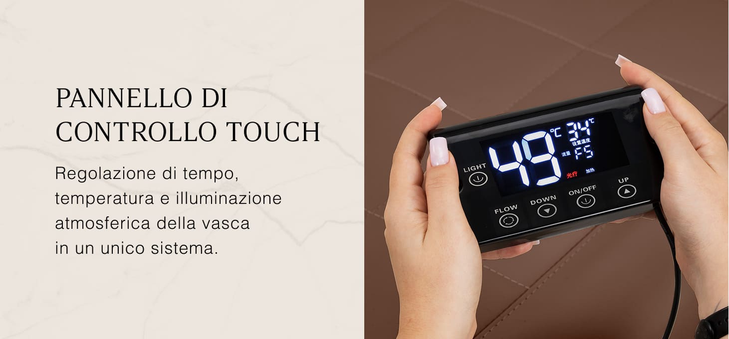 L'intuitivo pannello a sfioramento consente il pieno controllo dei parametri di trattamento e la facilità d'uso. Consente di regolare il tempo di funzionamento e la temperatura dell'acqua, nonché di monitorare i valori correnti su un display chiaro e di facile lettura. Inoltre, il pannello consente di attivare la funzione di terapia della luce, che illumina la vasca creando un'atmosfera di relax e lusso. Il set comprende anche un telecomando che consente di controllare comodamente il dispositivo per la terapia del vapore a distanza.