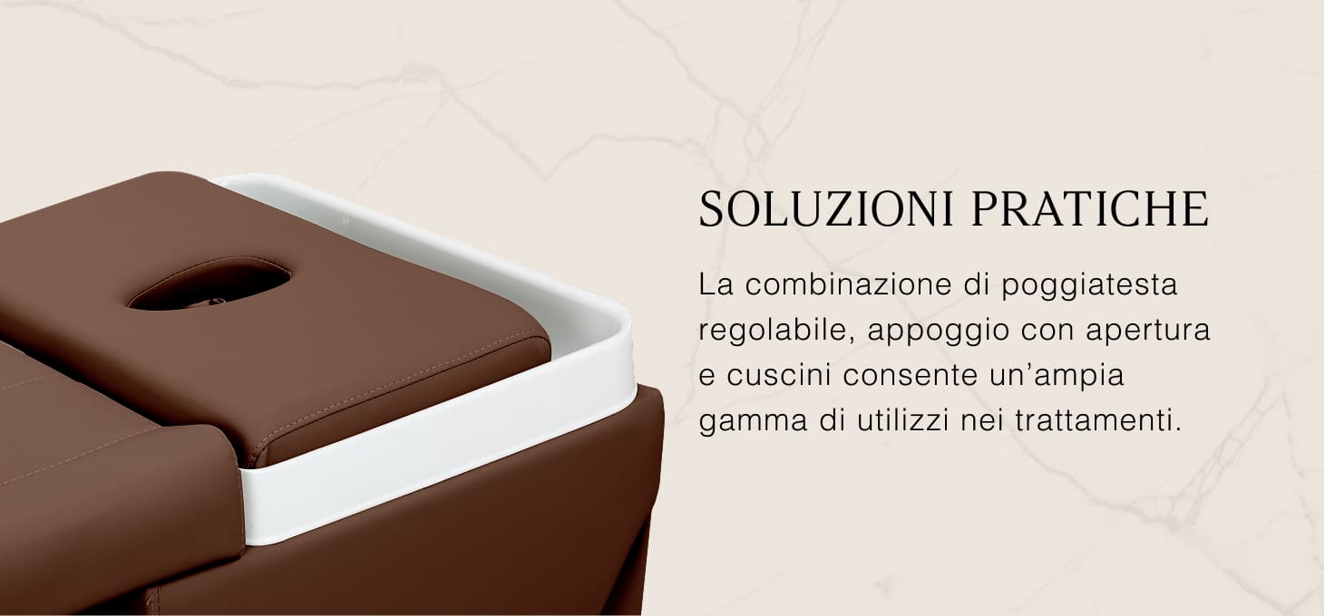 Il poggiatesta regolabile, con la possibilità di estendere e modificare l'angolo di inclinazione, permette di adattarsi perfettamente alle esigenze dell'utente, garantendo il massimo comfort. Il set comprende anche cuscini ergonomici, tra cui un poggiatesta con apertura per il viso, che amplia la gamma di applicazioni: dai trattamenti del cuoio capelluto ai massaggi e alle varie terapie del corpo e del viso. Queste pratiche caratteristiche rendono il lettino un'attrezzatura versatile per i saloni di bellezza e benessere, che combina il comfort del cliente con la funzionalità necessaria al professionista.