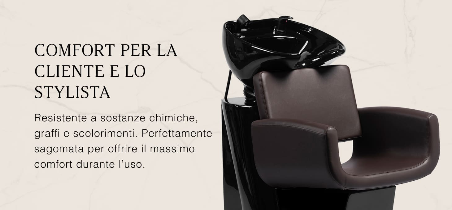 La profonda vasca in ceramica nei toni del nero riduce gli schizzi di acqua e cosmetici utilizzati durante i trattamenti. L'angolo di inclinazione regolabile consente di adattarsi alle esigenze individuali. Il materiale durevole è resistente a macchie, graffi e sostanze chimiche e la superficie liscia ne facilita la pulizia. Il collare ergonomico offre un comodo supporto per la testa.