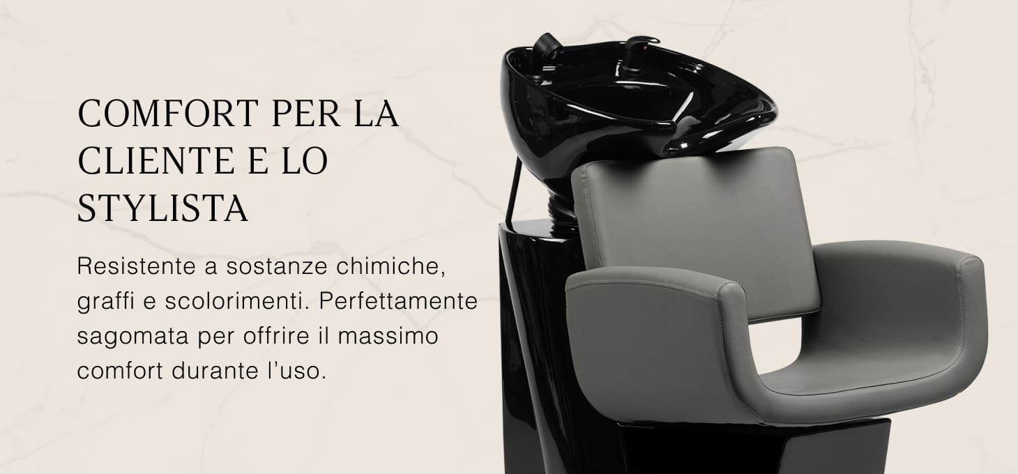 La profonda vasca in ceramica nei toni del nero riduce gli schizzi di acqua e cosmetici utilizzati durante i trattamenti. L'angolo di inclinazione regolabile consente di adattarsi alle esigenze individuali. Il materiale durevole è resistente a macchie, graffi e sostanze chimiche e la superficie liscia ne facilita la pulizia. Il collare ergonomico offre un comodo supporto per la testa.