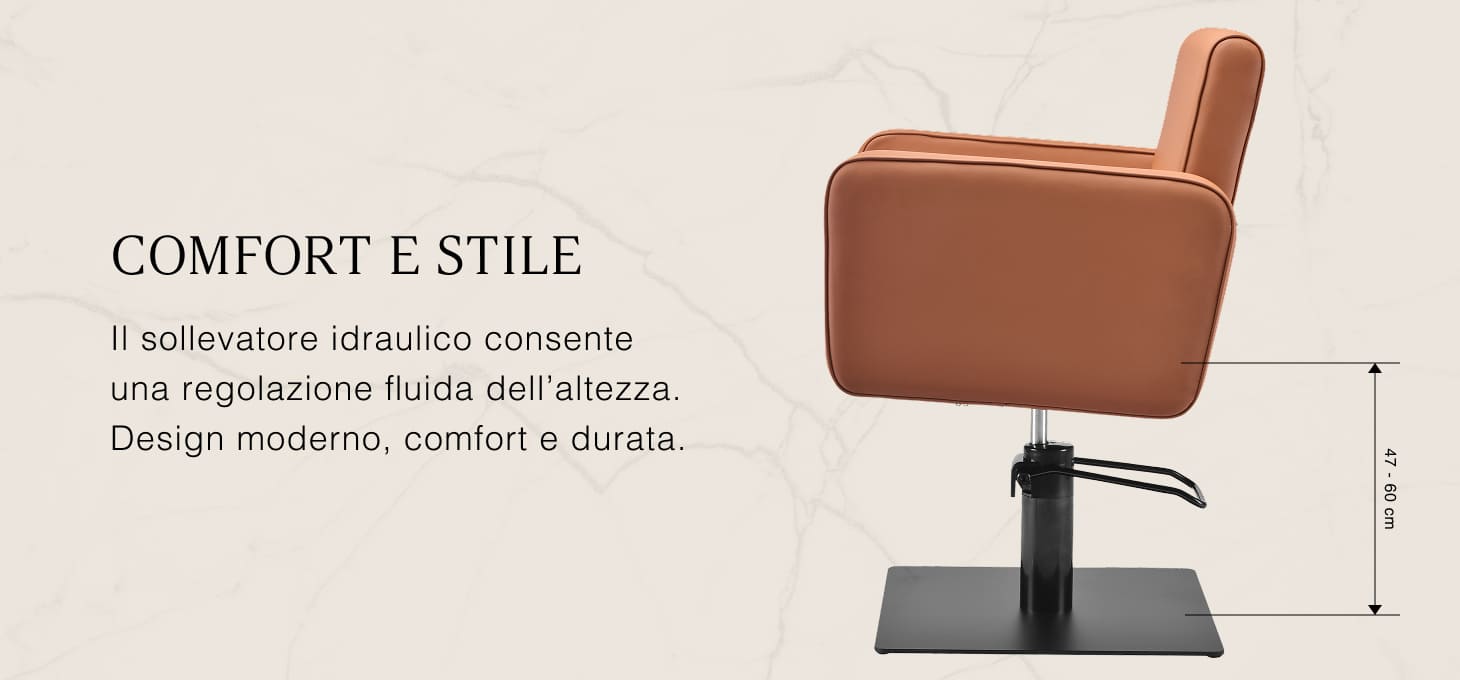 Il resistente sollevatore idraulico consente di regolare agevolmente l 'altezza della seduta da 47 a 60 cm, anche quando il cliente è sulla poltrona. Questo rende il lavoro più ergonomico e la posizione può essere facilmente regolata per adattarsi all'altezza del cliente e del parrucchiere. Il comodo schienale offre un supporto stabile alla schiena e facilita una posizione confortevole, particolarmente importante durante i trattamenti più lunghi, aumentando il comfort e la soddisfazione del cliente.