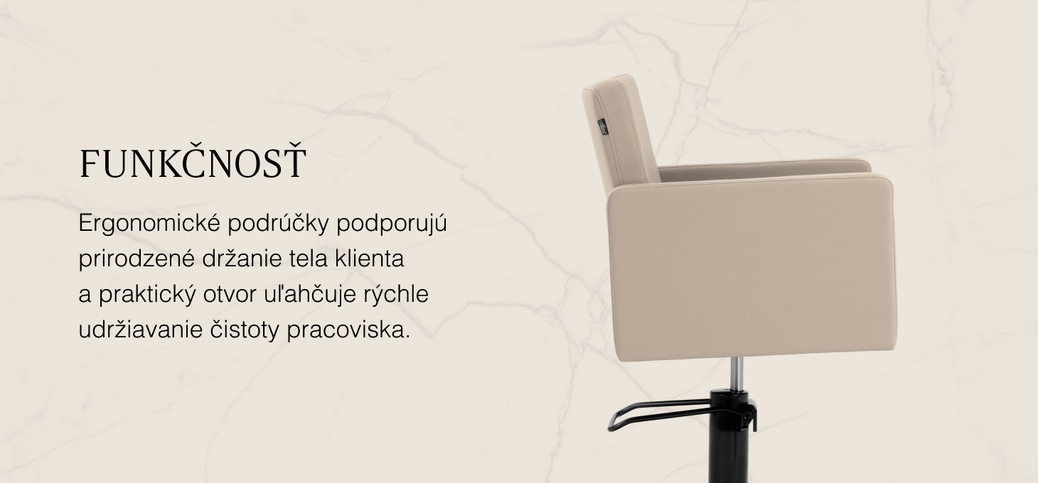 Il design ben studiato della poltrona garantisce il comfort anche durante i trattamenti più lunghi. Il sedile opportunamente sagomato e i braccioli ergonomici sostengono la postura naturale del cliente, facilitando il lavoro di precisione del parrucchiere. Il meccanismo di rotazione completa aumenta il raggio di movimento e la libertà di manovra, il che si traduce in fluidità ed efficienza dei servizi forniti. Il pratico foro tra il sedile e lo schienale consente di rimuovere rapidamente i capelli e di mantenere pulita la postazione.