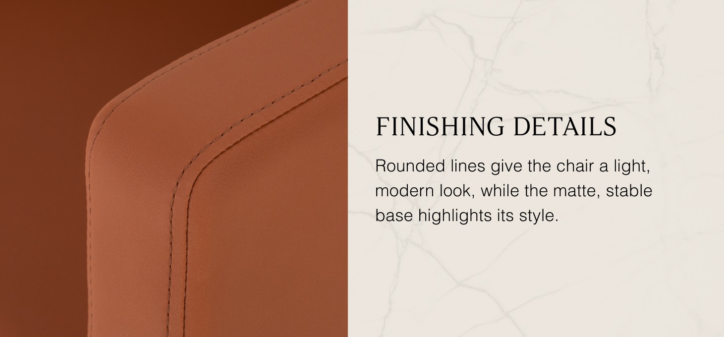 Le linee arrotondate della poltrona conferiscono leggerezza e un'estetica moderna, mentre la base stabile e quadrata in nero opaco ne sottolinea l'aspetto elegante. La pelle sintetica piacevole al tatto nei toni del marrone garantisce comfort anche durante trattamenti lunghi, oltre a garantire durata, resistenza all'umidità e facilità di pulizia. La poltrona si adatta sia agli arredi moderni che a quelli classici, sottolineando l'immagine professionale del salone.