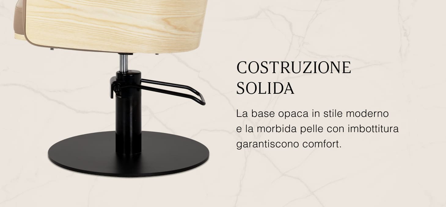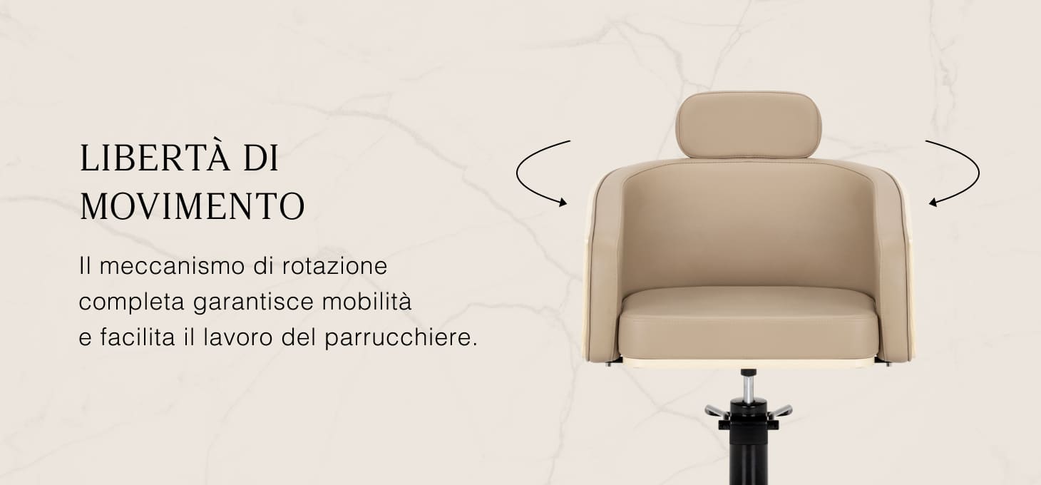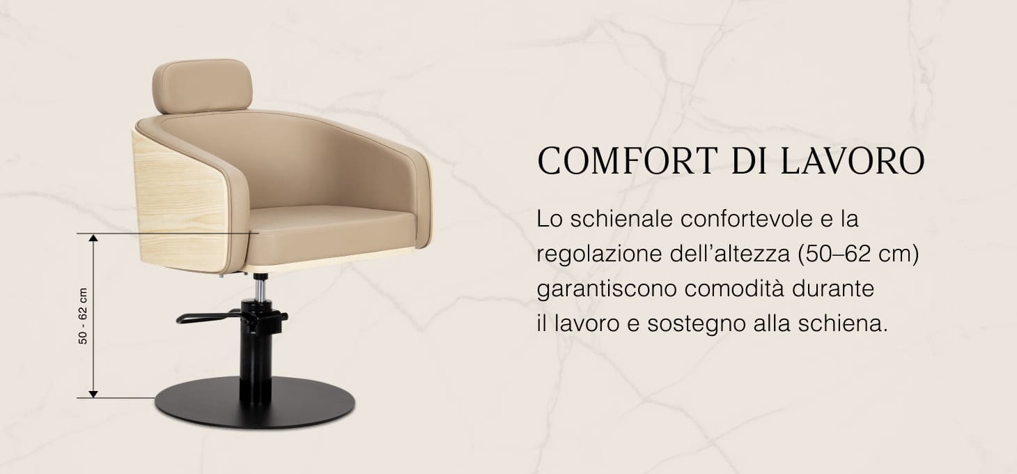 Il sedile imbottito di schiuma offre un elevato comfort anche durante i trattamenti più lunghi. Il meccanismo di rotazione completa aumenta la mobilità e la libertà di movimento, rendendo il lavoro del parrucchiere più fluido, efficiente e meno faticoso. I braccioli supportano la corretta postura del cliente, favorendo una posizione di seduta confortevole e consentendo uno styling e un taglio precisi.