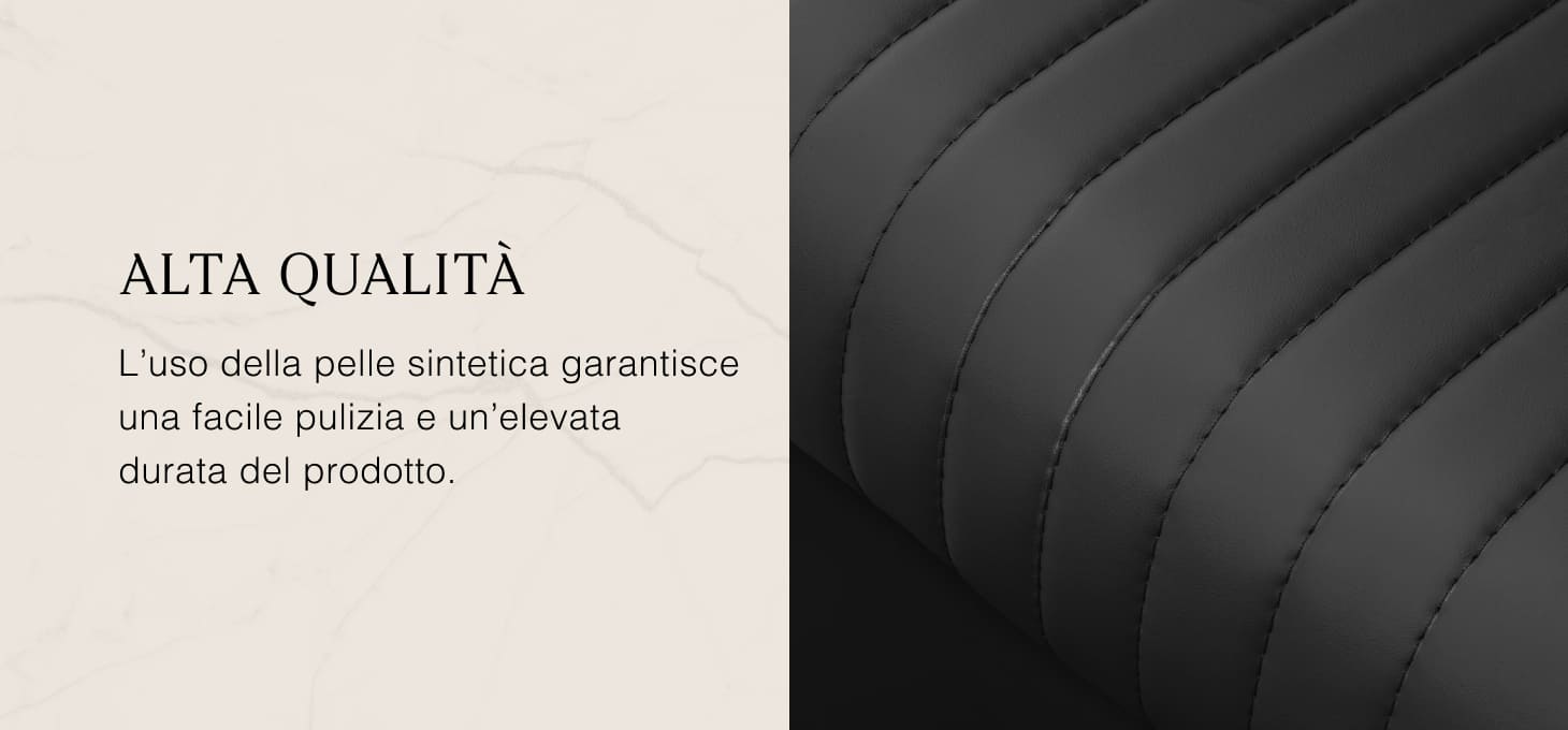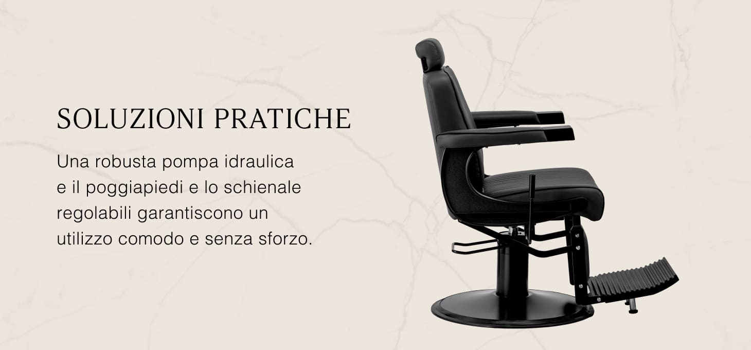 La robusta struttura della base garantisce stabilità ed elevato comfort. Il sedile è imbottito di schiuma resistente alla deformazione e rivestito di morbida pelle sintetica opaca, che unisce durata e comfort. I materiali utilizzati per la finitura sono resistenti all'umidità, durevoli e facili da pulire, rendendo la sedia perfetta per l'uso quotidiano. Le cuciture eleganti e il rivestimento nei toni del nero le conferiscono un carattere unico, integrandosi perfettamente con l'arredamento dei moderni barbieri.