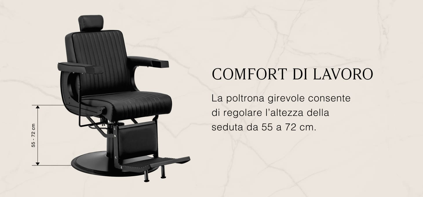 Il sedile imbottito di morbida schiuma offre un elevato livello di comfort al cliente, anche durante i trattamenti più lunghi. Lo schienale ergonomico sostiene la schiena e consente di assumere una posizione comoda, per un maggiore relax e una migliore esperienza di trattamento. Il meccanismo di rotazione completa della poltrona aumenta la libertà di movimento, facilitando l'accesso da tutti i lati e migliorando il flusso di lavoro dello stilista. I braccioli imbottiti, posti all'altezza ottimale, favoriscono il posizionamento naturale delle braccia e prevengono la tensione nella zona delle spalle e del collo.