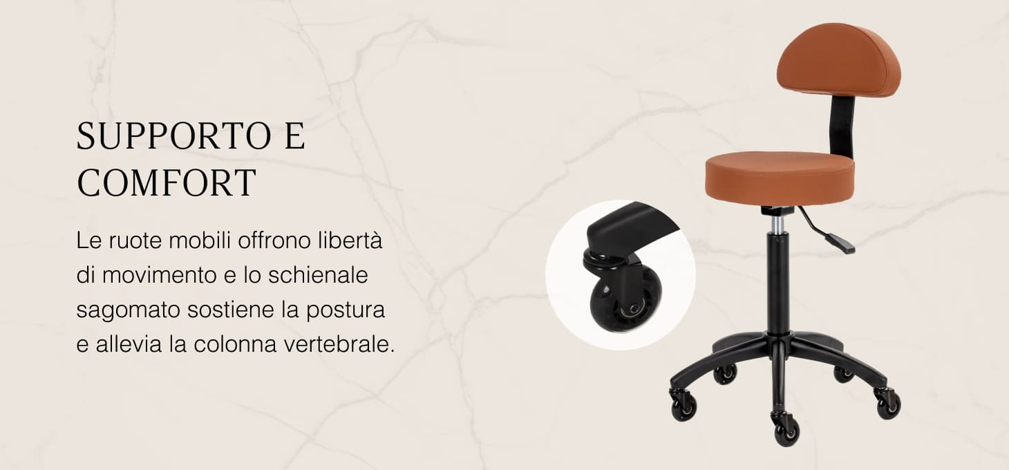 Il pratico sgabello per parrucchieri Gabbiano D026 con schienale è stato progettato tenendo conto del comfort e dell'ergonomia. Lo schienale profilato favorisce una postura corretta, alleviando la pressione sulla colonna vertebrale anche durante le lunghe ore di lavoro. La struttura stabile e le ruote ad alta mobilità garantiscono libertà di movimento e comfort assoluto.