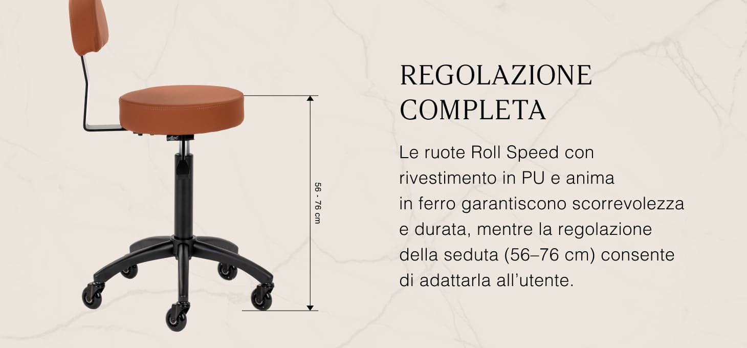 La regolazione dell'altezza del sedile varia da 56 a 76 cm, consentendo una posizione personalizzata in base alle esigenze individuali del professionista durante lo svolgimento dei servizi. Lo schienale sostiene la colonna vertebrale, assicurando il comfort anche durante il lavoro prolungato. Il meccanismo di rotazione completa aumenta la libertà di movimento, con conseguente maggiore comfort ed efficienza. La mobilità è garantita dalle ruote Roll Speed con nucleo in ferro e rivestimento in poliuretano (PU), che combinano un movimento fluido con un'eccezionale resistenza all'usura. L'uso di cuscinetti ABEC-7 rende lo sgabello facile da spostare, facilitando notevolmente le manovre.