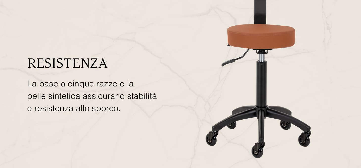 Lo sgabello è montato su una base nera a cinque stelle con finitura semi-opaca, che garantisce un'eccellente stabilità anche durante l'uso intensivo. La seduta è rivestita in resistente pelle sintetica in eleganti tonalità di marrone, resistente all'umidità, alle macchie e all'uso quotidiano, mentre l'imbottitura in schiuma mantiene la sua forma anche in caso di uso prolungato. Il design moderno ed estetico rende questo sgabello perfetto per gli interni professionali. È una scelta pratica ed elegante per i saloni di parrucchiere, i saloni di bellezza e gli istituti di bellezza dove il comfort, la solidità della struttura e l'eleganza dell 'arredamento sono essenziali.