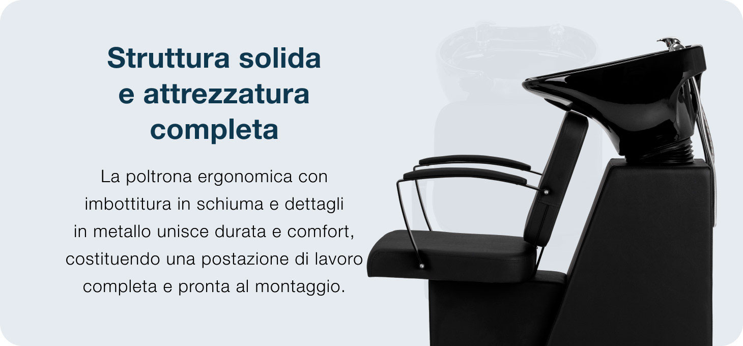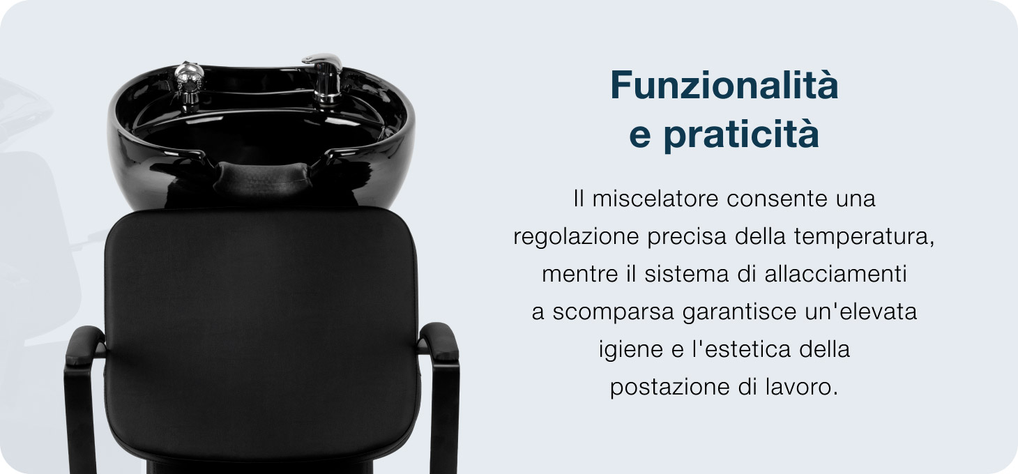 Il lavaggio è dotato di un miscelatore che garantisce un accesso costante all'acqua calda e fredda e la possibilità di regolare con precisione la temperatura in base alle esigenze e alle preferenze del cliente. Il pratico spazio per riporre la doccetta semplifica il lavoro quotidiano, mentre il tappo con filtro integrato consente di controllare il flusso dell'acqua e aiuta a mantenere un elevato livello di igiene nel salone. Il raccordo dell'acqua situato all'interno della base consente di nascondere esteticamente l'impianto. La poltrona opportunamente sagomata garantisce il comfort durante l'esecuzione di vari trattamenti, mentre la combinazione di soluzioni funzionali e comfort pratici si traduce in un comfort ancora maggiore durante il lavoro nel salone di parrucchiere.