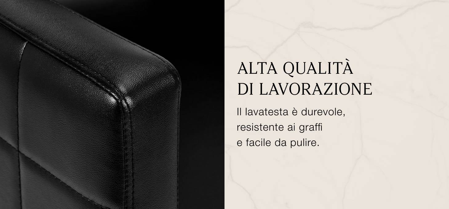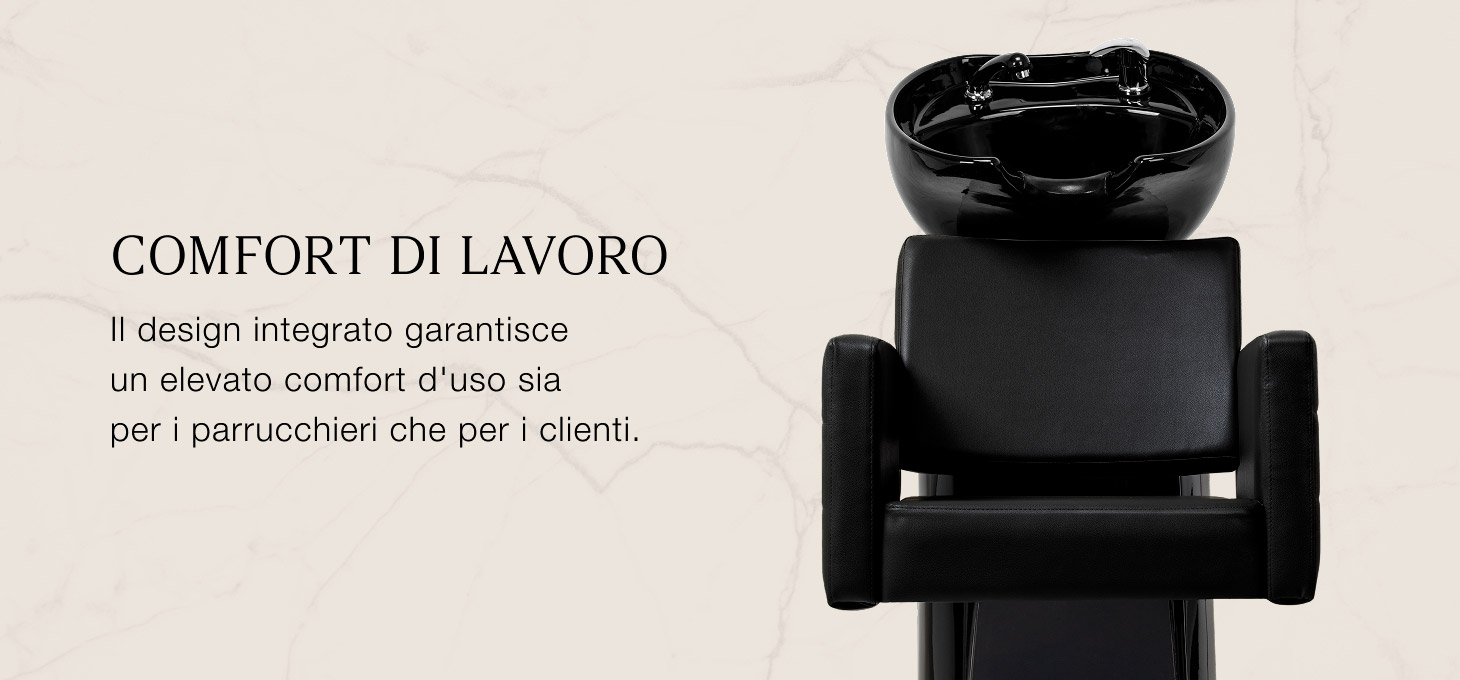 La profonda ciotola in ceramica nei toni del nero riduce efficacemente gli schizzi di acqua e dei preparati utilizzati durante i trattamenti. Ciò favorisce un'esecuzione confortevole e precisa dei vari servizi di parrucchiere. La struttura mobile della ciotola consente di regolare facilmente l'angolo di inclinazione in base alle esigenze individuali. Il materiale utilizzato è durevole, resistente allo scolorimento e ai graffi e facile da mantenere pulito. Il collare opportunamente profilato offre un comodo appoggio per la testa durante il lavaggio, mentre il confortevole rivestimento in plastica nei toni del nero elimina la sensazione di freddezza della superficie ceramica.
