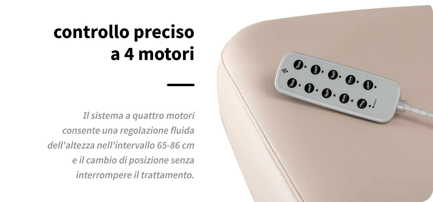L'intuitivo telecomando consente una regolazione fluida su quattro piani: altezza, inclinazione dello schienale, poggiapiedi e funzione culla. La regolazione elettrica dell'altezza nell'intervallo 65-86 cm e la modifica precisa degli angoli di inclinazione consentono di adattare perfettamente la posizione del lettino al tipo di trattamento eseguito. L'ampia gamma di regolazioni facilita il mantenimento di una posizione di lavoro ergonomica, indipendentemente dall'altezza del professionista o dalla specificità della procedura. La possibilità di regolare contemporaneamente lo schienale e il poggiapiedi con un solo pulsante consente di impostare rapidamente la posizione seduta, semi-sdraiata o sdraiata, senza dover interrompere il trattamento. La regolazione fluida delle impostazioni favorisce l'ergonomia del lavoro e aumenta il comfort del cliente in ogni fase della procedura.