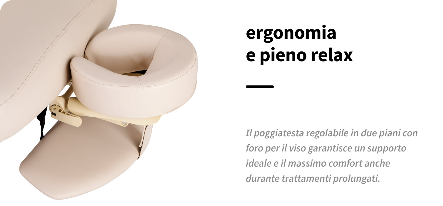 Il poggiatesta ergonomico con apertura per il viso, incluso nel set, assicura una comoda posizione della testa durante i trattamenti eseguiti sulla schiena, sull'addome e in posizione supina. Un sostegno adeguato aumenta il comfort del cliente anche durante le procedure più lunghe e favorisce il completo rilassamento. L'elemento è regolabile in inclinazione su due piani, il che consente di adattare con precisione l'impostazione al tipo di trattamento e alle esigenze individuali.