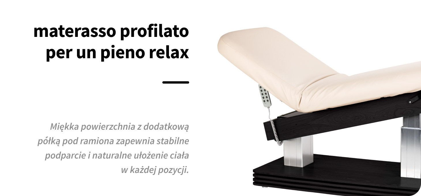 La superficie profilata del lettino favorisce una posizione naturale e comoda del corpo, garantendo un supporto stabile e confortevole su tutta la lunghezza. La larghezza adeguata e il materasso morbido aumentano il comfort del cliente, soprattutto durante i trattamenti più lunghi. Un maggiore comfort significa una migliore esperienza del trattamento e uno standard più elevato dei servizi offerti dal centro. L'aggiunta di un ripiano sotto le braccia aumenta il comfort nella posizione prona, alleggerendo la parte superiore del corpo e favorendo il completo rilassamento.