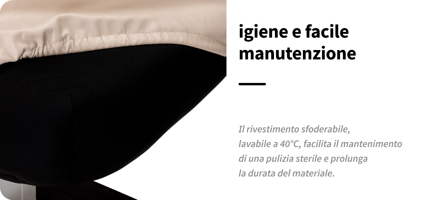 Il rivestimento sfoderabile del materasso è un vero e proprio aiuto nel lavoro quotidiano. La possibilità di rimuoverlo rapidamente e lavarlo (a mano o in lavatrice a 40 °C) consente di mantenere facilmente un elevato standard di igiene nel salone. Una breve asciugatura a bassa temperatura accelera la preparazione della postazione di lavoro. Una cura adeguata senza l'uso di alcool e detergenti aggressivi aiuta a mantenere l'aspetto estetico e la durata del materiale più a lungo.
