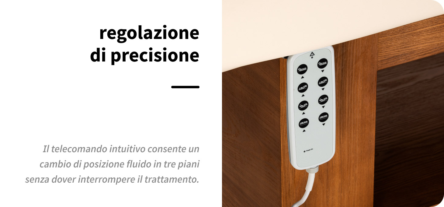 L'intuitivo telecomando consente una regolazione fluida su tre piani: altezza, schienale e poggiapiedi. La regolazione dell'altezza nell'intervallo 65-90 cm consente di adattare l'impostazione all'altezza del professionista e al tipo di trattamento. L'ampia gamma di regolazioni facilita il mantenimento di una posizione di lavoro ergonomica, indipendentemente dall'altezza del professionista o dalla specificità della procedura. La possibilità di regolare contemporaneamente lo schienale e il poggiapiedi con un solo pulsante consente di impostare rapidamente la posizione seduta, semi-sdraiata o sdraiata, senza dover interrompere il trattamento. La regolazione fluida delle impostazioni favorisce l'ergonomia del lavoro e aumenta il comfort del cliente in ogni fase della procedura.