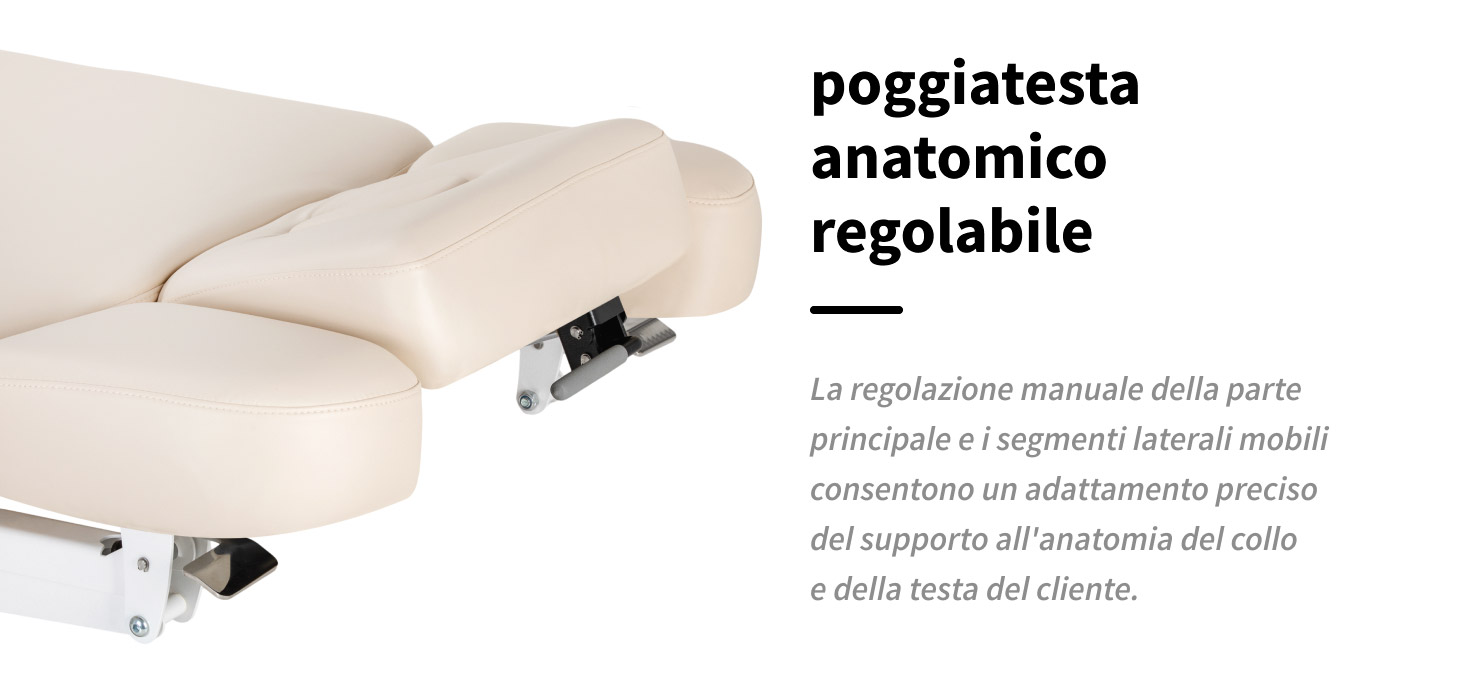 Il poggiatesta è stato progettato per garantire il massimo comfort al cliente e la massima funzionalità al professionista. La parte principale è regolabile manualmente, consentendo di impostare la posizione ottimale di sostegno della testa, mentre i segmenti laterali si muovono verso l'alto e verso il basso, adattandosi all'anatomia individuale del cliente. Questa soluzione garantisce una posizione comoda durante i trattamenti, sostiene la posizione corretta e aumenta il comfort sia del cliente che della persona che esegue il trattamento.