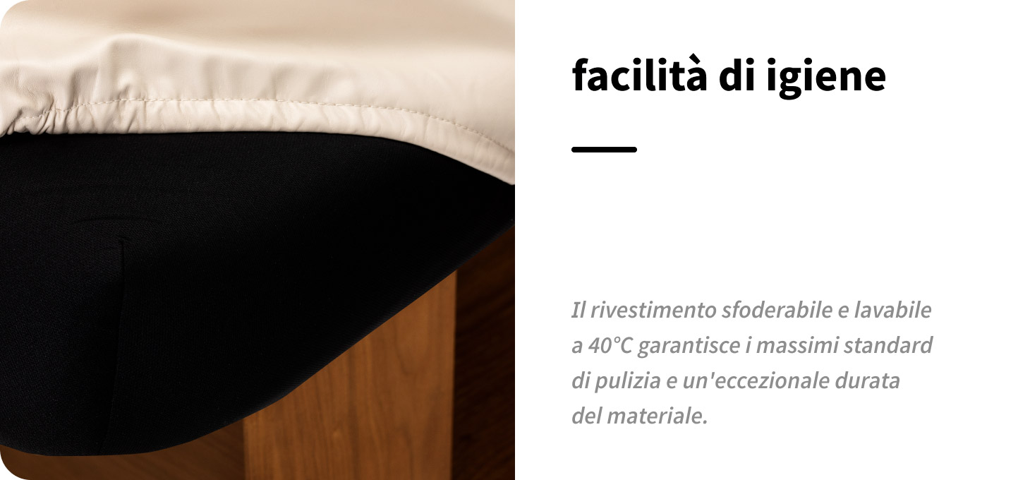 Il rivestimento sfoderabile del materasso è un vero aiuto nel lavoro quotidiano. La possibilità di rimuoverlo rapidamente e lavarlo (a mano o in lavatrice a 40 °C) consente di mantenere facilmente un elevato standard di igiene nel salone. Una breve asciugatura a bassa temperatura accelera la preparazione della postazione di lavoro. Una cura adeguata senza l'uso di alcool e detergenti aggressivi aiuta a mantenere l'aspetto estetico e la durata del materiale più a lungo.