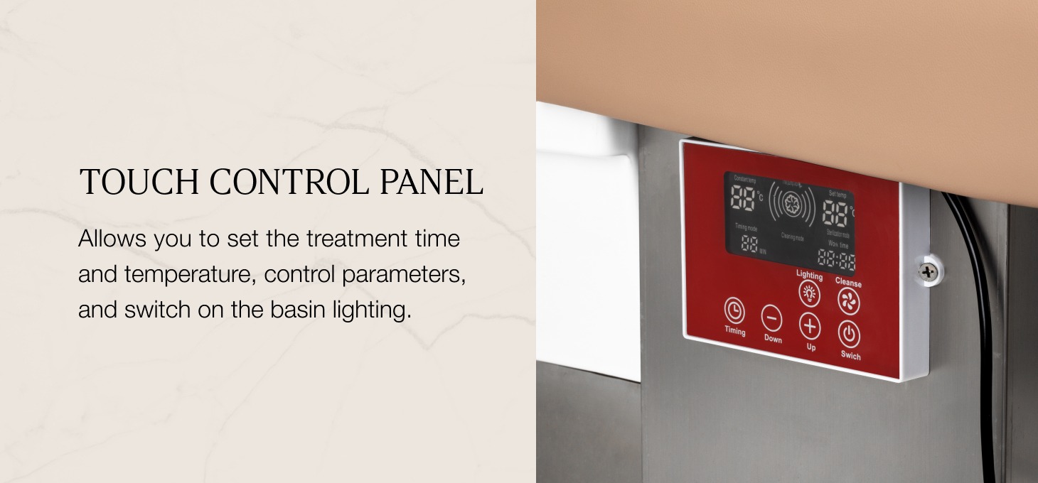L'intuitivo pannello a sfioramento consente il pieno controllo dei parametri di trattamento, garantendo la praticità d'uso. Permette di regolare il tempo di lavoro e la temperatura dell'acqua e di monitorare i valori correnti. Grazie al display integrato, è possibile verificare in qualsiasi momento la durata del funzionamento dell'apparecchio. Il pannello consente anche di attivare la funzione di terapia della luce, cioè di illuminare la vasca, creando un'atmosfera di relax e lusso. Inoltre, l'unità per la terapia del vapore è dotata di un telecomando per un comodo utilizzo a distanza.