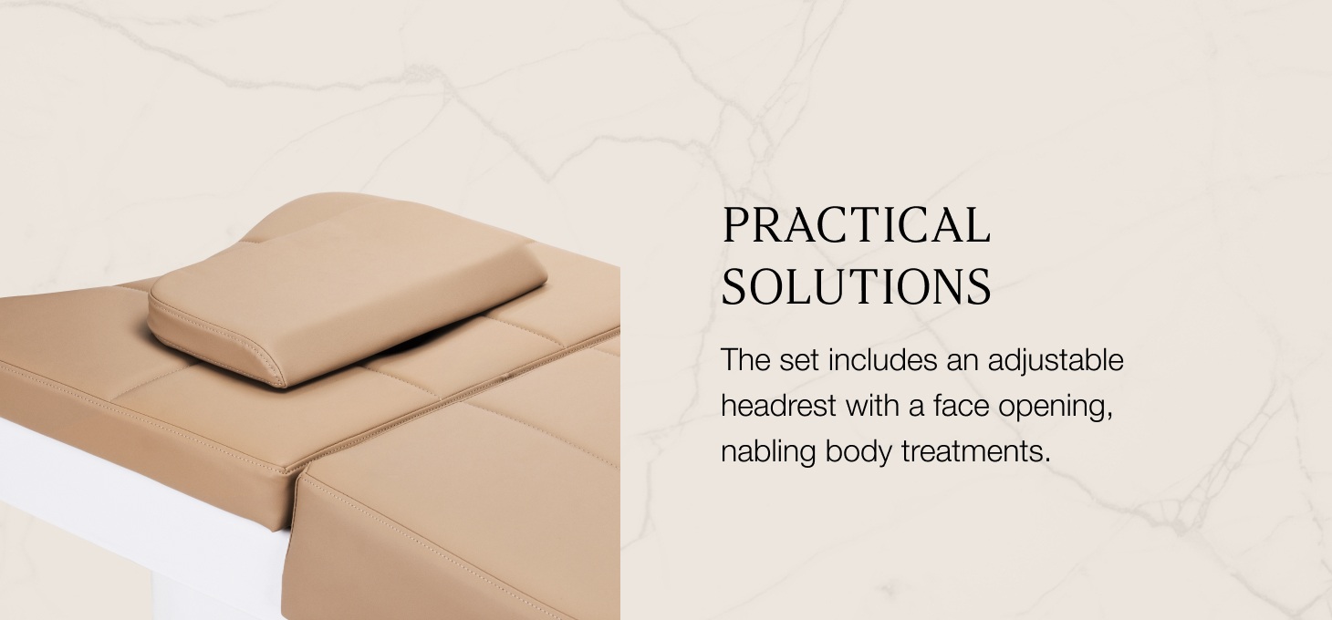 Un poggiatesta regolabile con estensione e angolazione assicura una perfetta vestibilità dell'utente, aumentando il comfort durante i trattamenti. Sono inclusi anche cuscini ergonomici, tra cui un poggiatesta con apertura per il viso, che consente di eseguire non solo procedure di cura del cuoio capelluto, ma anche massaggi e una varietà di trattamenti per il corpo e il viso. Grazie a queste pratiche soluzioni, il lettino diventa un'attrezzatura versatile per i saloni di bellezza e benessere, garantendo il comfort e l'efficacia di qualsiasi terapia.