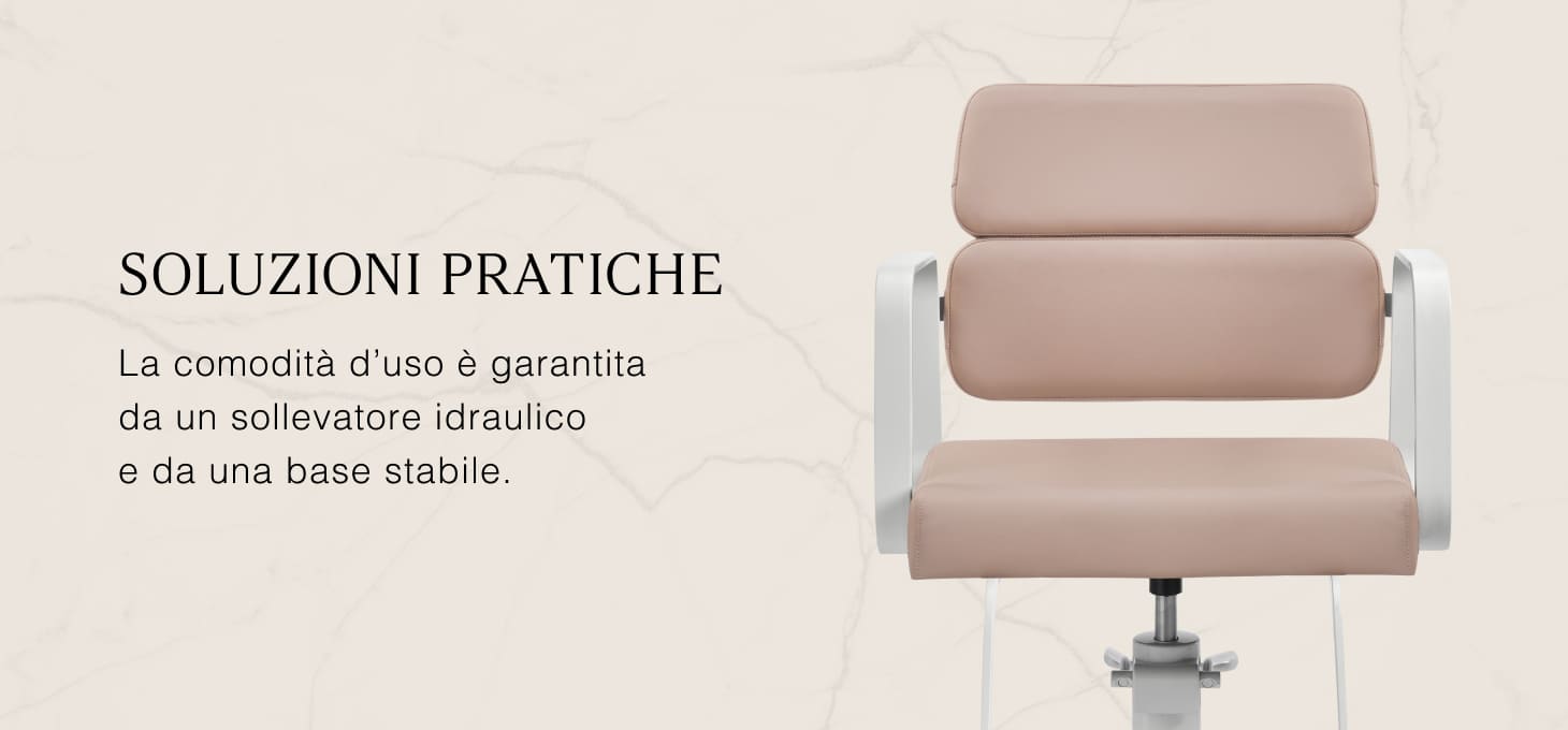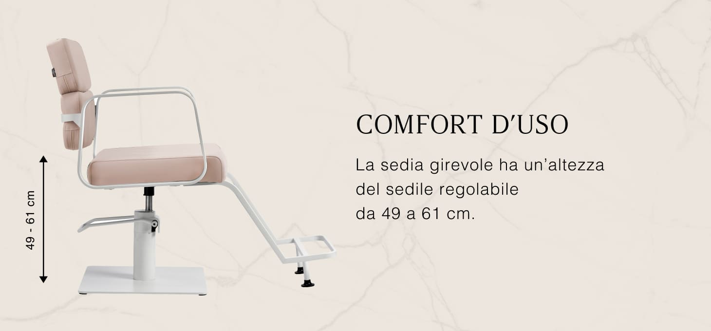 Il resistente sollevatore idraulico consente di regolare il livello della seduta nell'intervallo 49-61 cm, anche quando il cliente è seduto sulla poltrona. Questo sistema offre un ambiente di lavoro più ergonomico, consentendo di regolare il livello della seduta in base all'altezza del cliente e del parrucchiere. Lo schienale, molto interessante dal punto di vista estetico, consente di assumere una posizione comoda, fornendo un eccellente sostegno alla schiena, particolarmente importante per i trattamenti che si protraggono per ore. Un grande vantaggio di questo modello è il foro lasciato tra lo schienale e la seduta. Questo facilita la pulizia del salone, consentendo di spazzare via facilmente i capelli da ogni angolo della poltrona. In questo modo è più facile preparare la postazione di lavoro tra un cliente e l'altro.