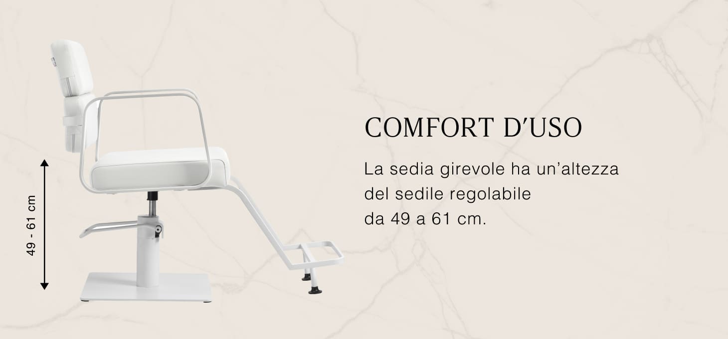 Il resistente sollevatore idraulico consente di regolare il livello della seduta nell'intervallo 49-61 cm, anche quando il cliente è seduto sulla poltrona. Questo sistema offre un ambiente di lavoro più ergonomico, consentendo di regolare il livello della seduta in base all'altezza del cliente e del parrucchiere. Lo schienale, molto interessante dal punto di vista estetico, consente di assumere una posizione comoda, fornendo un eccellente sostegno alla schiena, particolarmente importante per i trattamenti che si protraggono per ore. Un grande vantaggio di questo modello è il foro lasciato tra lo schienale e la seduta. Questo facilita la pulizia del salone, consentendo di spazzare via facilmente i capelli da ogni angolo della poltrona. In questo modo è più facile preparare la postazione di lavoro tra un cliente e l'altro.