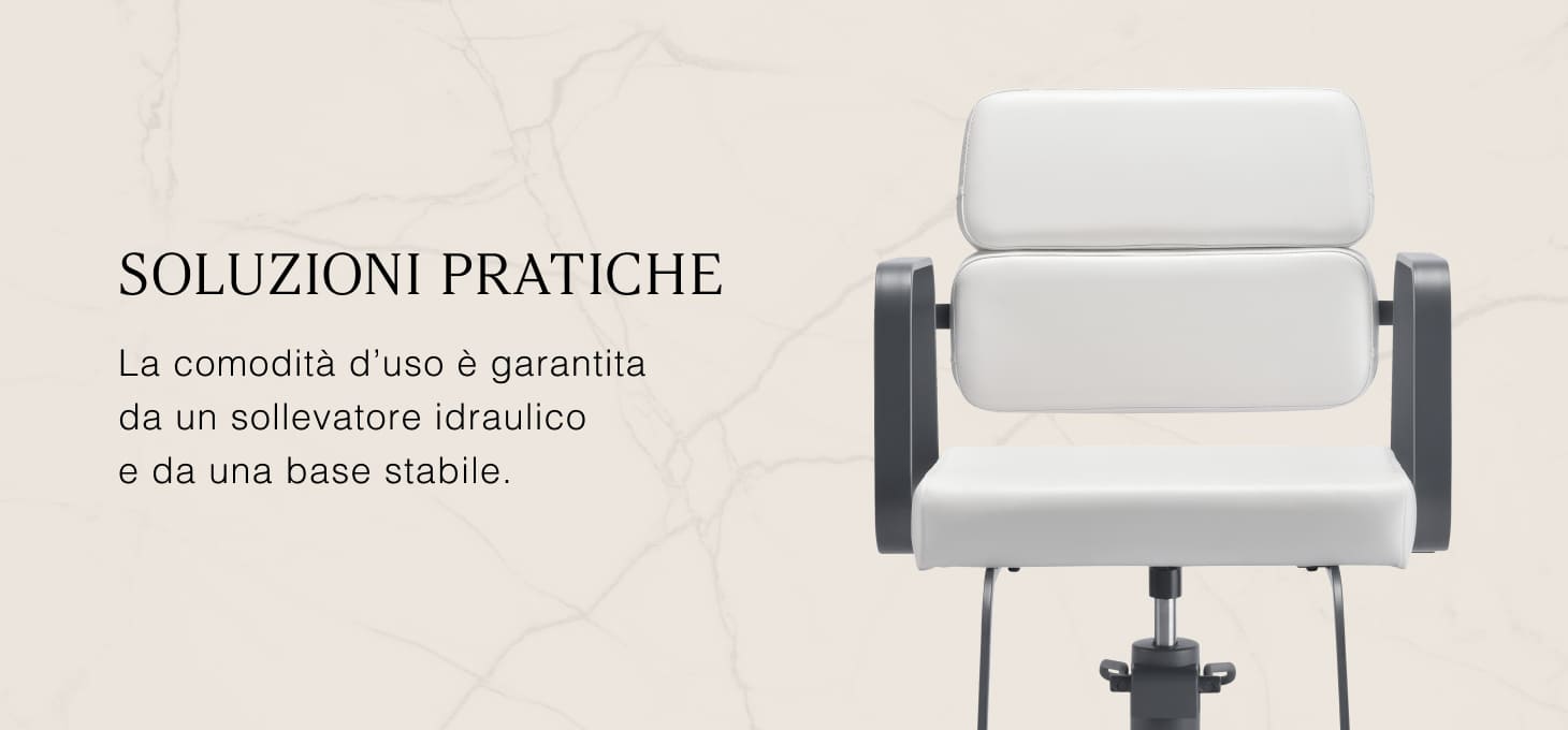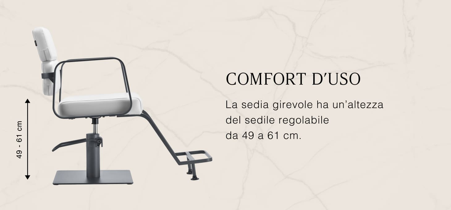 Il resistente sollevatore idraulico consente di regolare il livello della seduta nell'intervallo 49-61 cm, anche quando il cliente è seduto sulla poltrona. Questo sistema offre un ambiente di lavoro più ergonomico, consentendo di regolare il livello della seduta in base all'altezza del cliente e del parrucchiere. Lo schienale, molto interessante dal punto di vista estetico, consente di assumere una posizione comoda, fornendo un eccellente sostegno alla schiena, particolarmente importante per i trattamenti che si protraggono per ore. Un grande vantaggio di questo modello è il foro lasciato tra lo schienale e la seduta. Questo facilita la pulizia del salone, consentendo di spazzare via facilmente i capelli da ogni angolo della poltrona. In questo modo è più facile preparare la postazione di lavoro tra un cliente e l'altro.