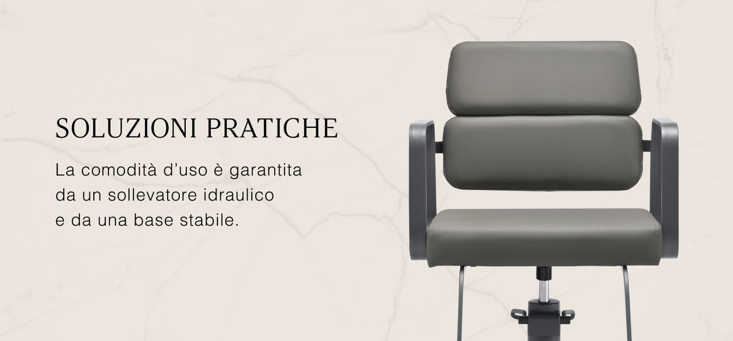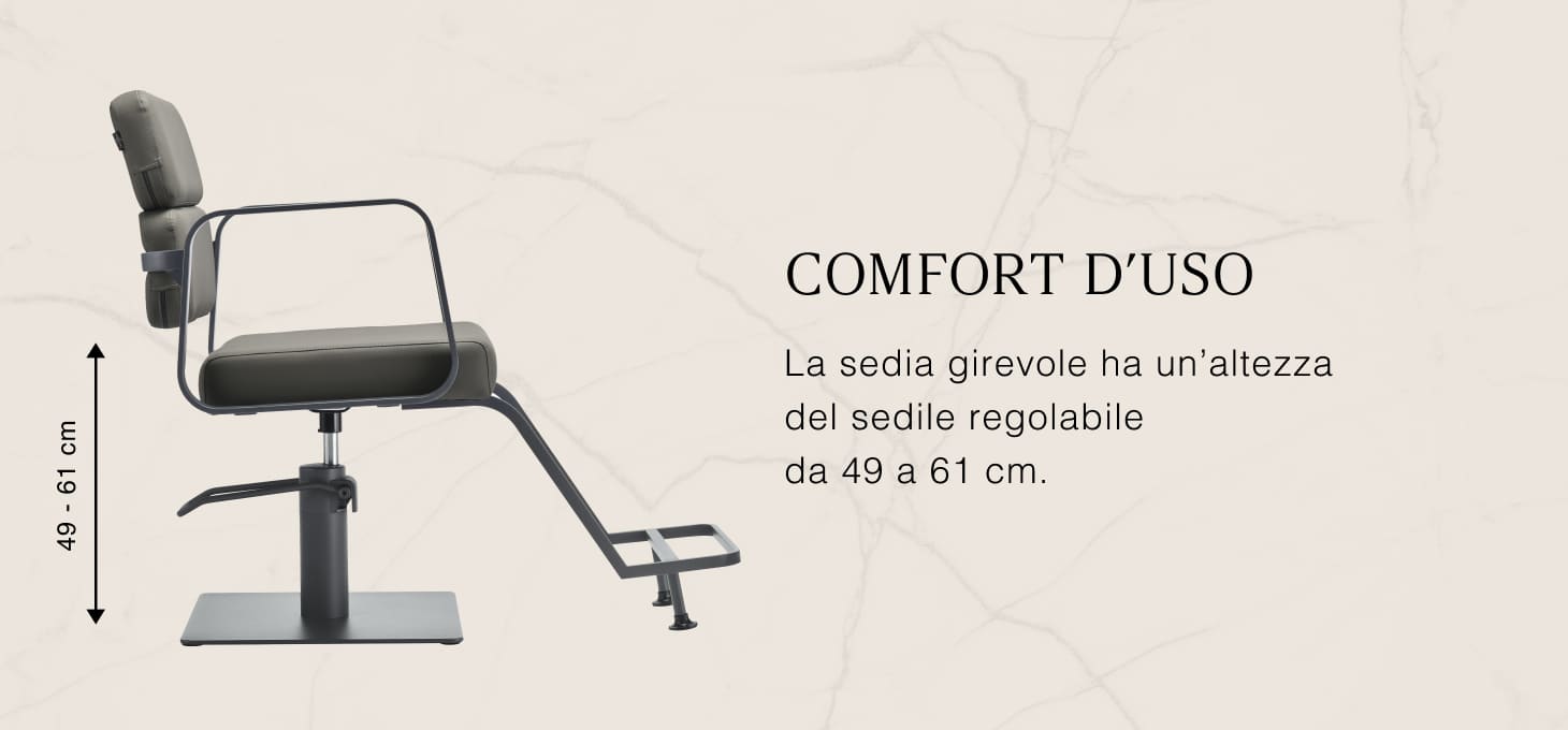 Il resistente sollevatore idraulico consente di regolare il livello della seduta nell'intervallo 49-61 cm, anche quando il cliente è seduto sulla poltrona. Questo sistema offre un ambiente di lavoro più ergonomico, consentendo di regolare il livello della seduta in base all'altezza del cliente e del parrucchiere. Lo schienale, molto interessante dal punto di vista estetico, consente di assumere una posizione comoda, fornendo un eccellente sostegno alla schiena, particolarmente importante per i trattamenti che si protraggono per ore. Un grande vantaggio di questo modello è il foro lasciato tra lo schienale e la seduta. Questo facilita la pulizia del salone, consentendo di spazzare via facilmente i capelli da ogni angolo della poltrona. In questo modo è più facile preparare la postazione di lavoro tra un cliente e l'altro.