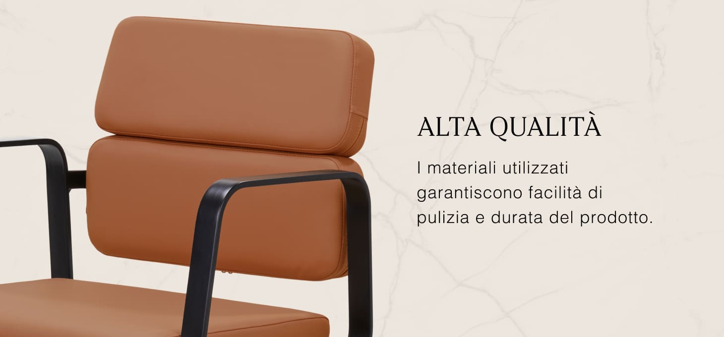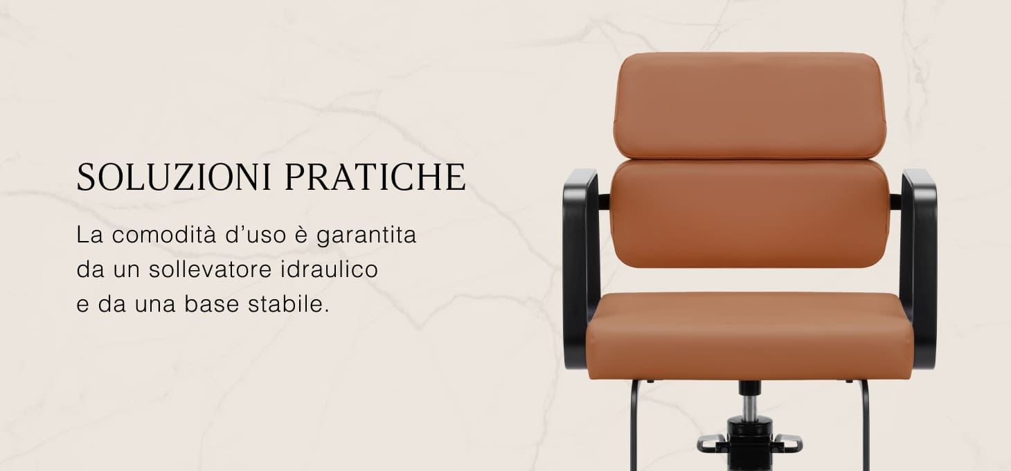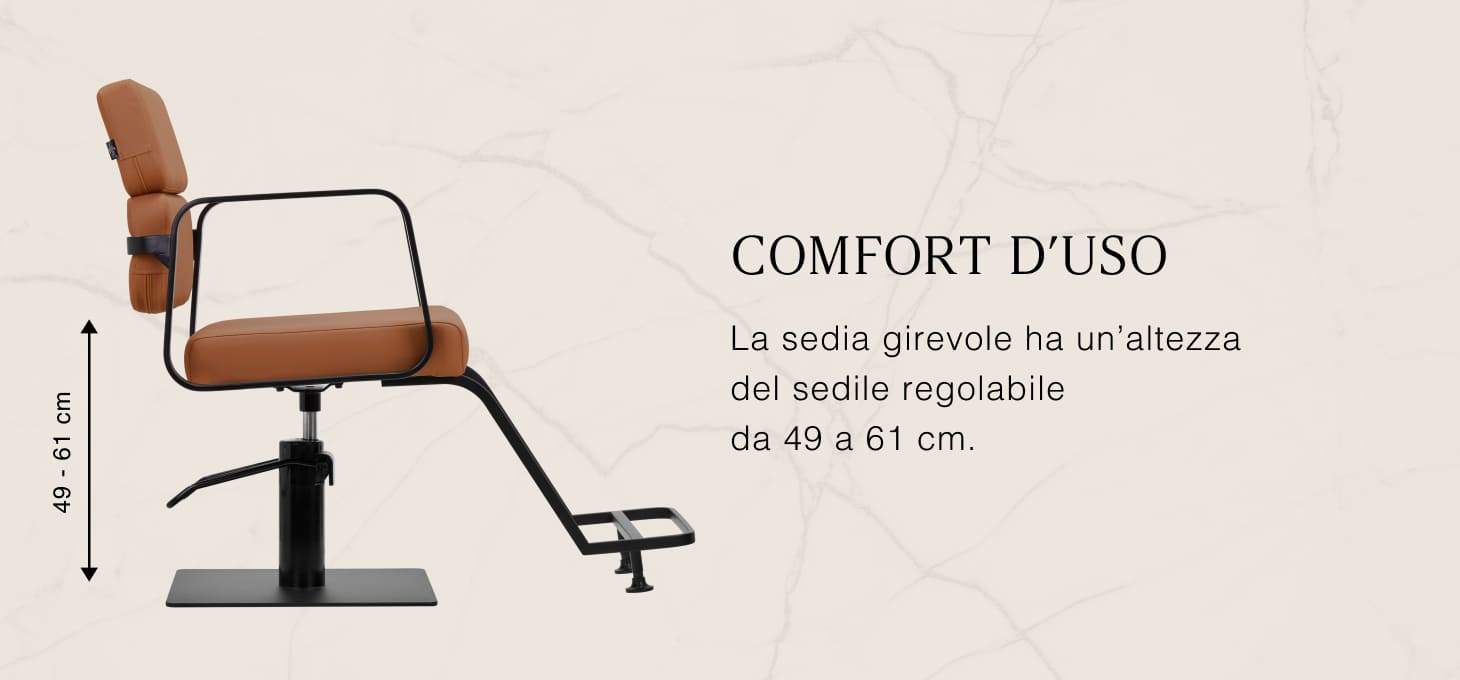 Il resistente sollevatore idraulico consente di regolare il livello della seduta nell'intervallo 49-61 cm, anche quando il cliente è seduto sulla poltrona. Questo sistema offre un ambiente di lavoro più ergonomico, consentendo di regolare il livello della seduta in base all'altezza del cliente e del parrucchiere. Lo schienale, molto interessante dal punto di vista estetico, consente di assumere una posizione comoda, fornendo un eccellente sostegno alla schiena, particolarmente importante per i trattamenti che si protraggono per ore. Un grande vantaggio di questo modello è il foro lasciato tra lo schienale e la seduta. Questo facilita la pulizia del salone, consentendo di spazzare via facilmente i capelli da ogni angolo della poltrona. In questo modo è più facile preparare la postazione di lavoro tra un cliente e l'altro.